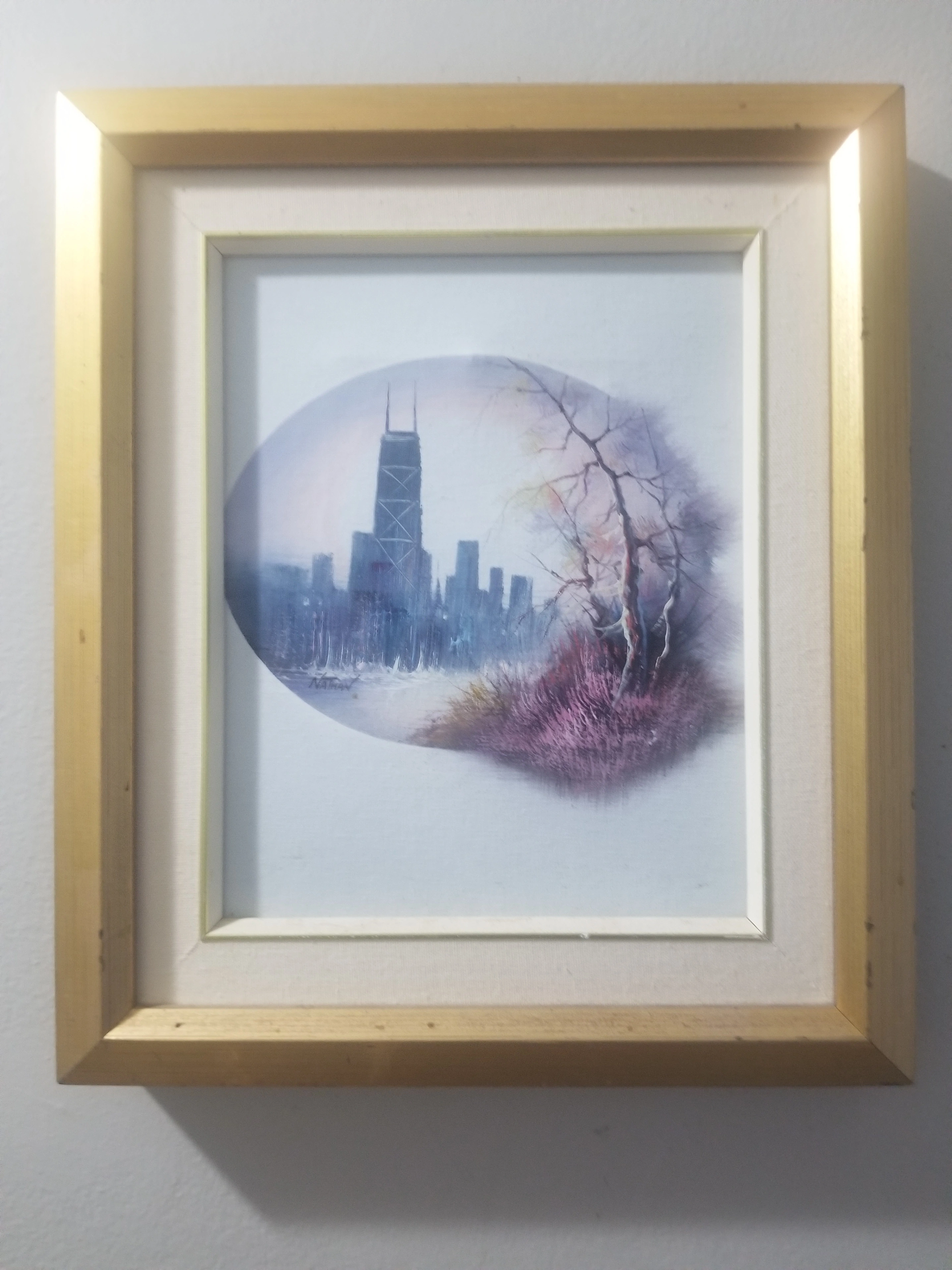 A small, atmospheric painting featuring a misty city skyline blended with a quiet natural landscape. Soft, muted tones create a calm, reflective mood as urban architecture fades into bare trees and textured ground. Beautifully framed and ideal for adding a subtle, contemplative touch to any room.