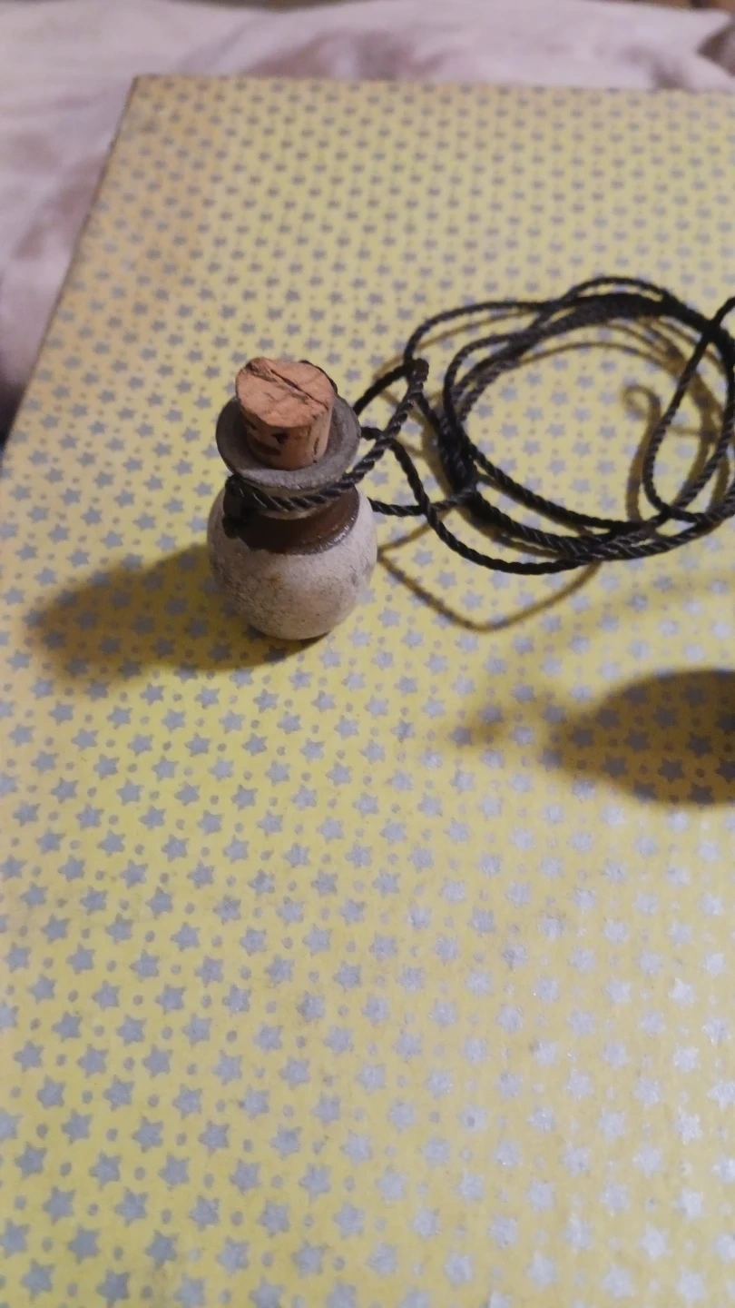 A tiny, handcrafted pendant resembling a miniature bottle with a cork stopper and a dark cord. This unique piece adds a whimsical touch to any outfit. Great for displaying tiny keepsakes or as a unique gift! Can be used as a diffuser! Sold separately!
