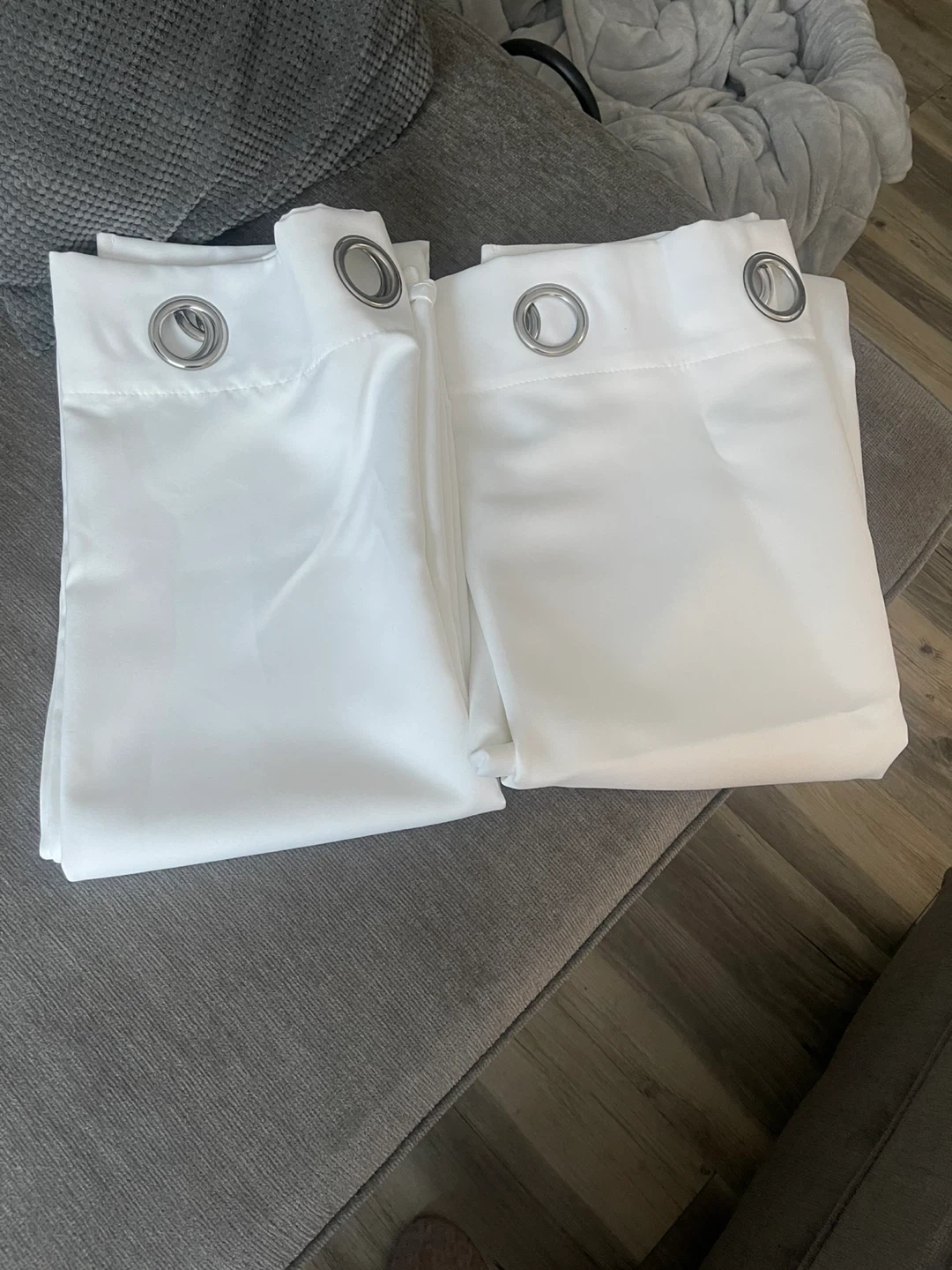 Brand new. Two white curtains with grommets at the top. Material appears to be polyester or a blend. Ready to hang! They are not black out but dark.