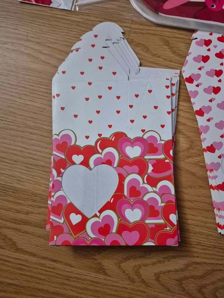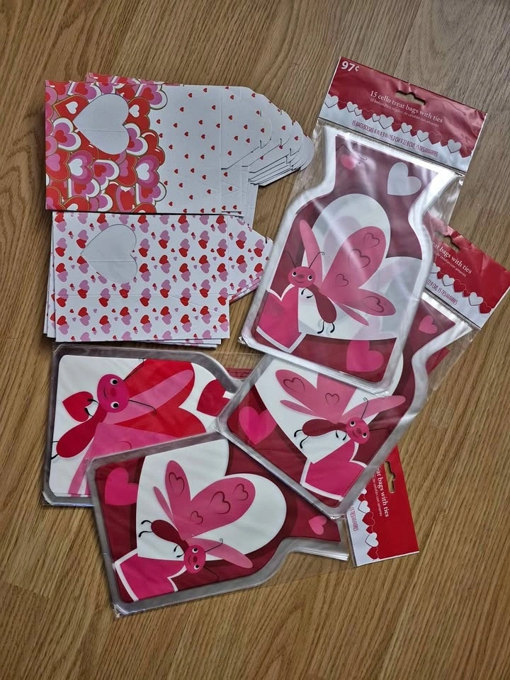 4 packs of Valentine's loot bags for candy or goodies. There are about 15 bags in each pack - maybe 1 or 2 missing. So, about 50-55 bags in all, with ties. 2 designs of little treat boxes. 16 boxes in total. All for $5. Pick up near North Talbot Park off Walker road.
