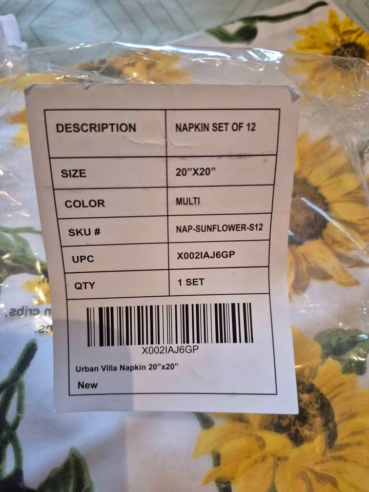 Set of 12 dinner napkins. 100% cotton. I have used 3 of the set - washed and ironed. The other 9 are still folded as they were packed. The design didn't go with my other accessories hence selling these.