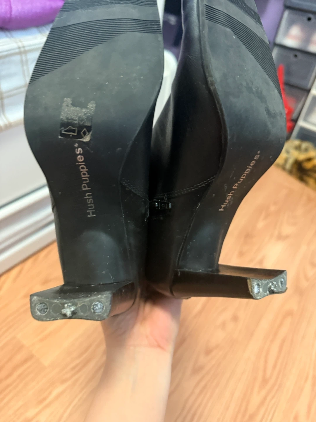 These are black leather ankle boots from Hush Puppies. They feature a side zipper closure and a square toe. Perfect for dressing up or down! Just need some rubber replacement from the heel. See photo.