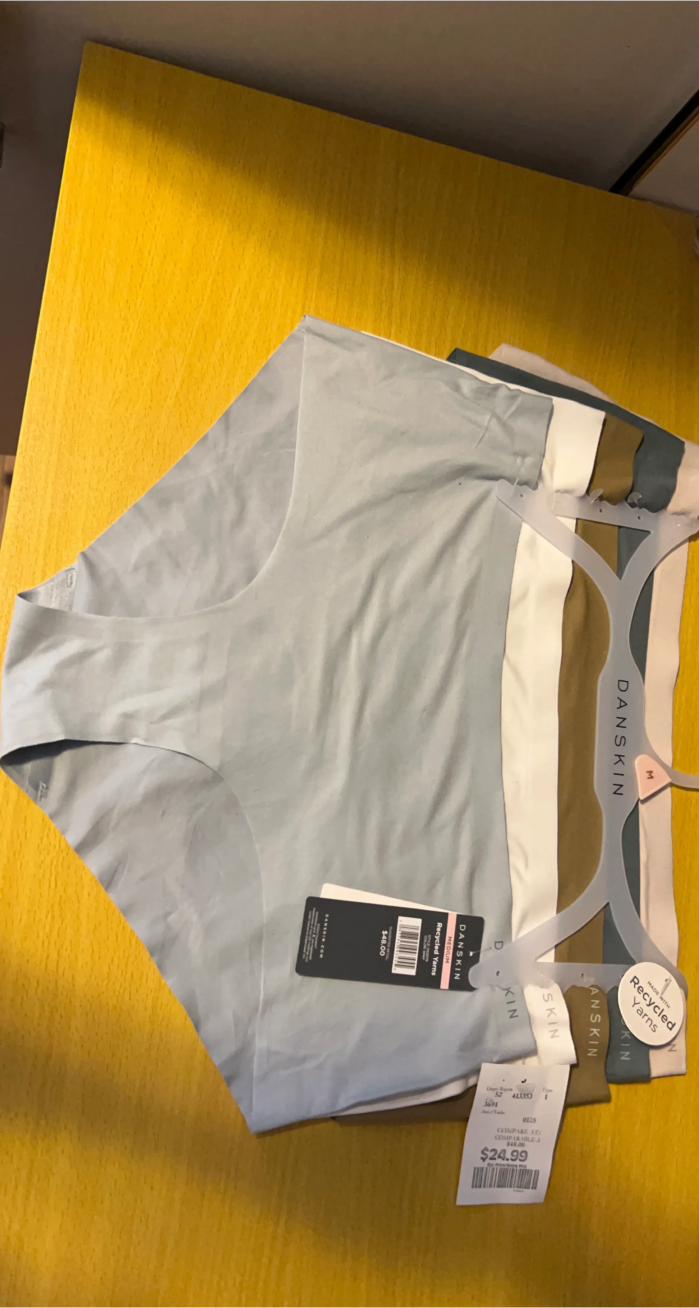 Danskin underwear multipack made with recycled yarns. They're size medium and come in assorted colours. Originally priced at $24.99, now offered at $15.99.