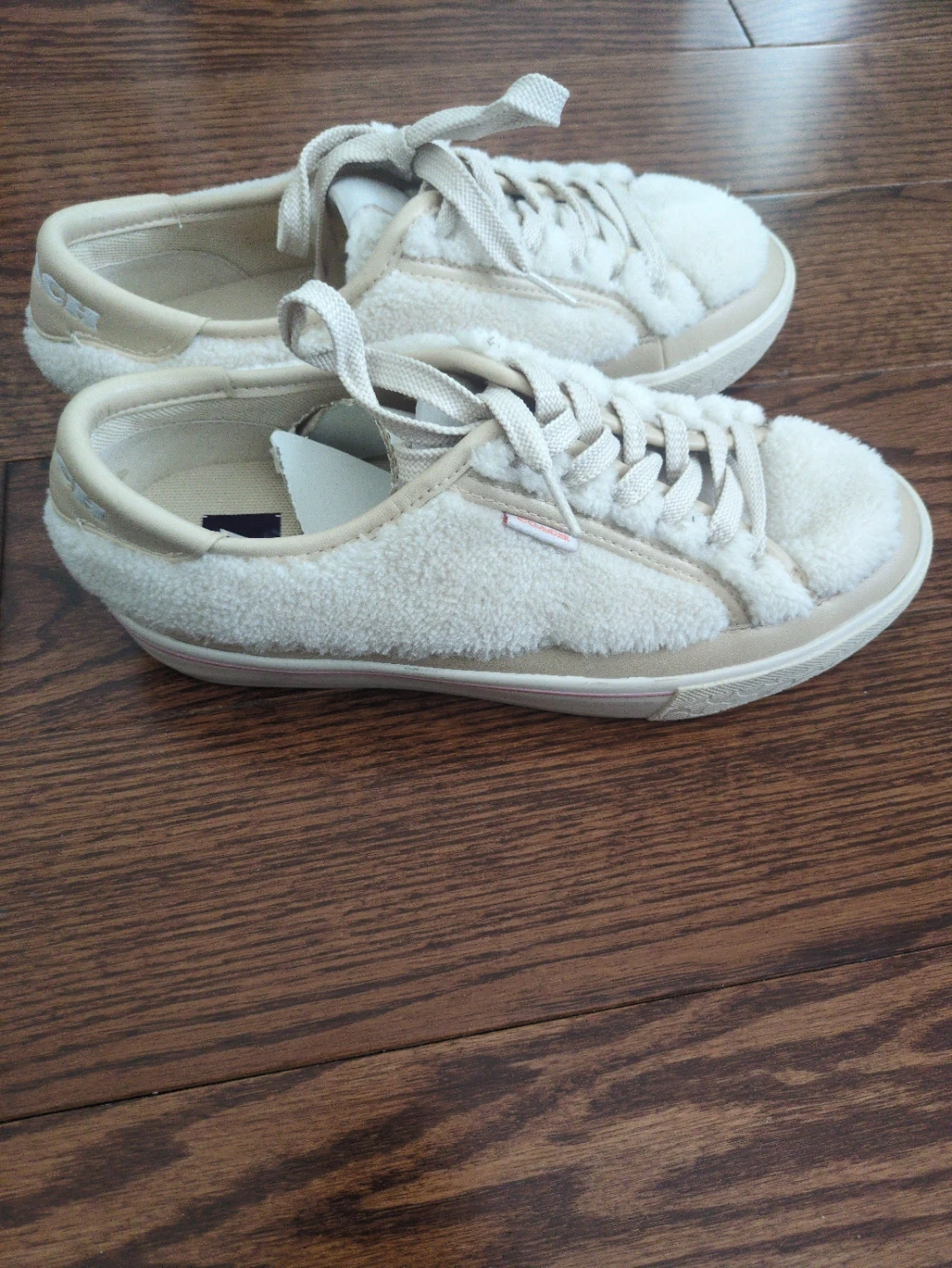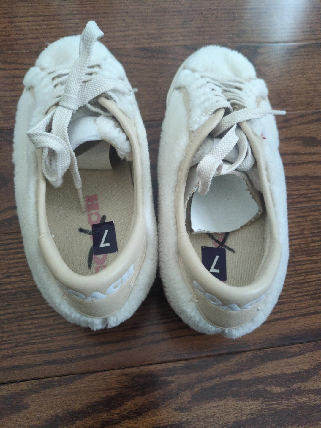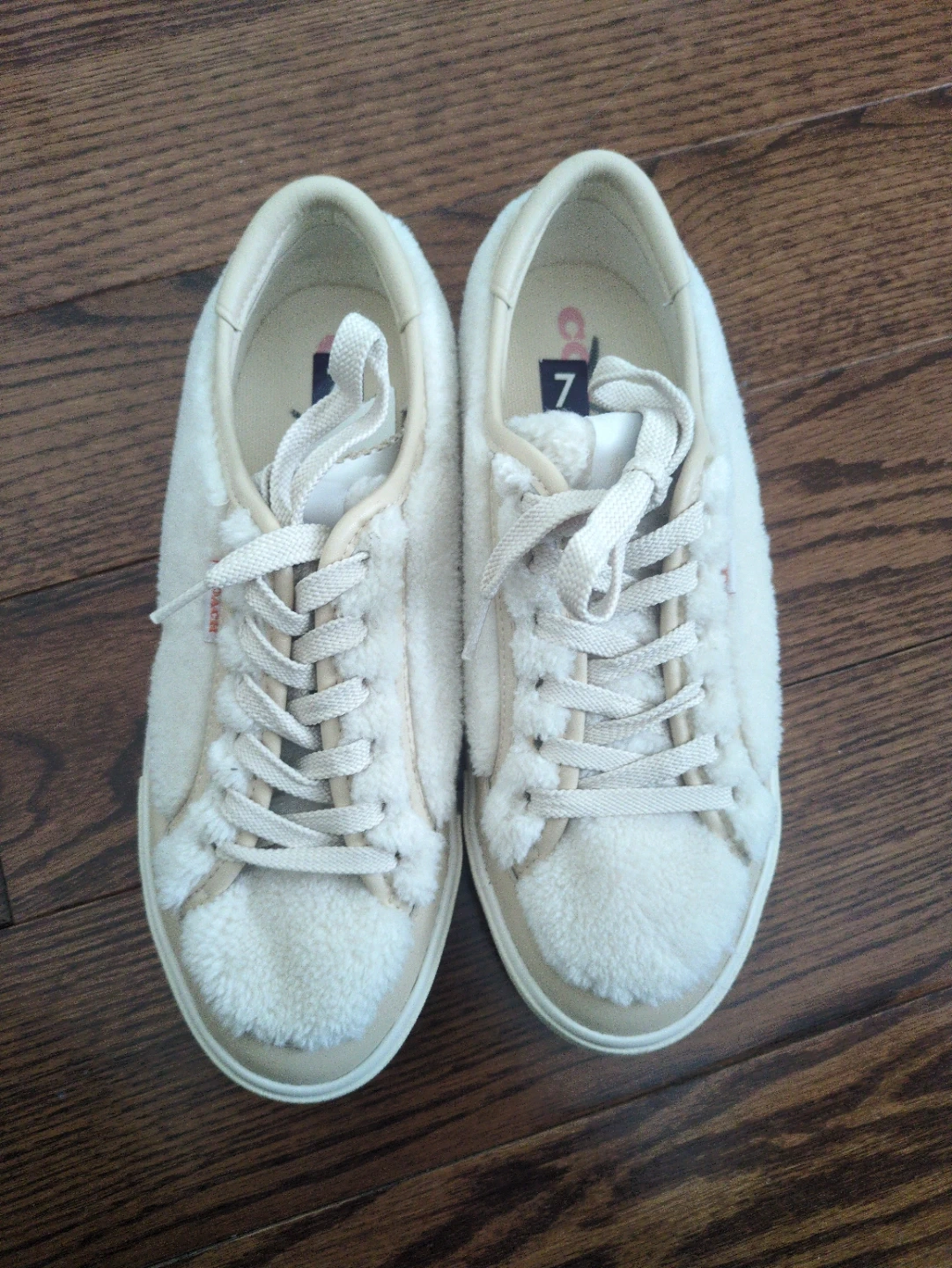 Cozy cream-coloured sneakers from Coach. Features a fluffy teddy exterior and lace-up closure. Size is 7.