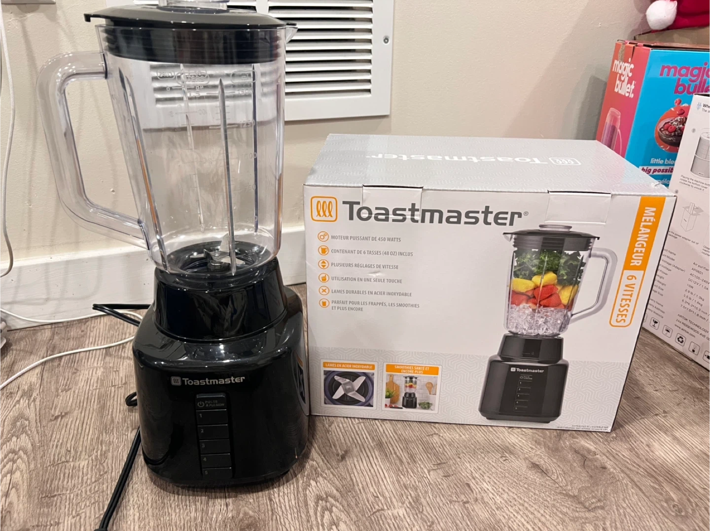 Toastmaster 450 Watt blender with 6 speeds. It has a 48 oz capacity and durable stainless steel blades. Perfect for smoothies and more! Use 1 more