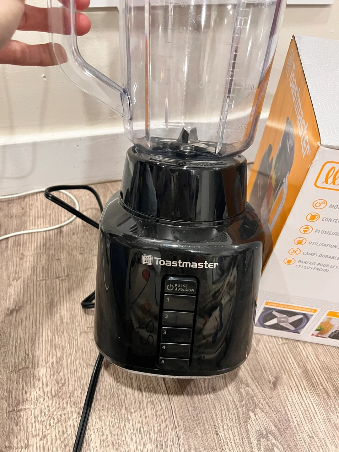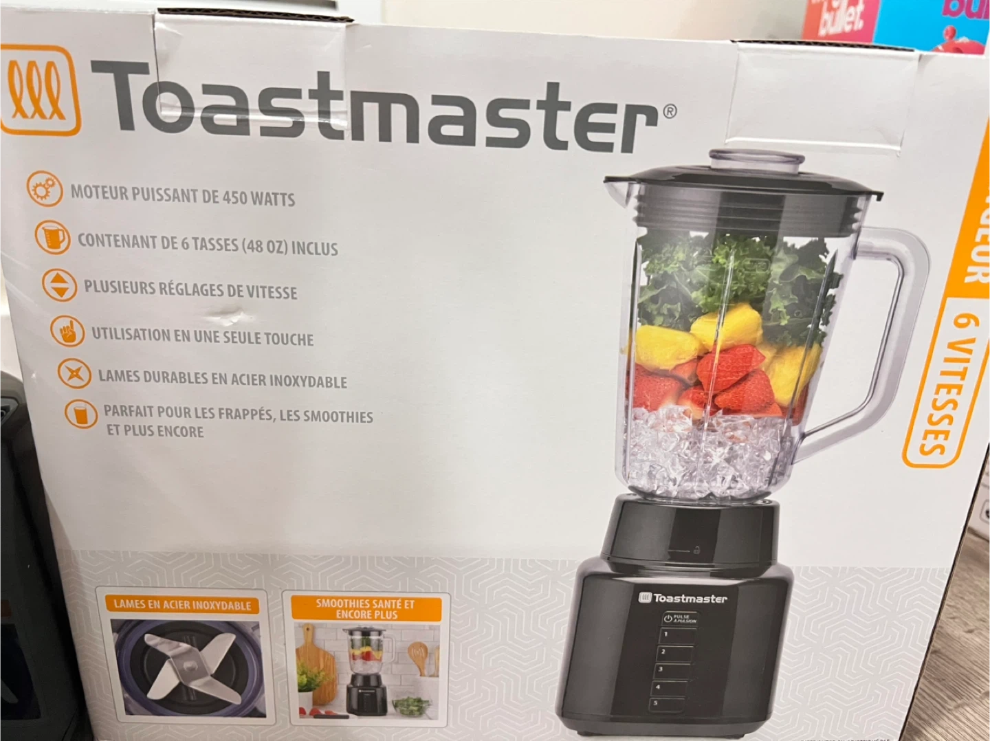 Toastmaster 450 Watt blender with 6 speeds. It has a 48 oz capacity and durable stainless steel blades. Perfect for smoothies and more! Use 1 more
