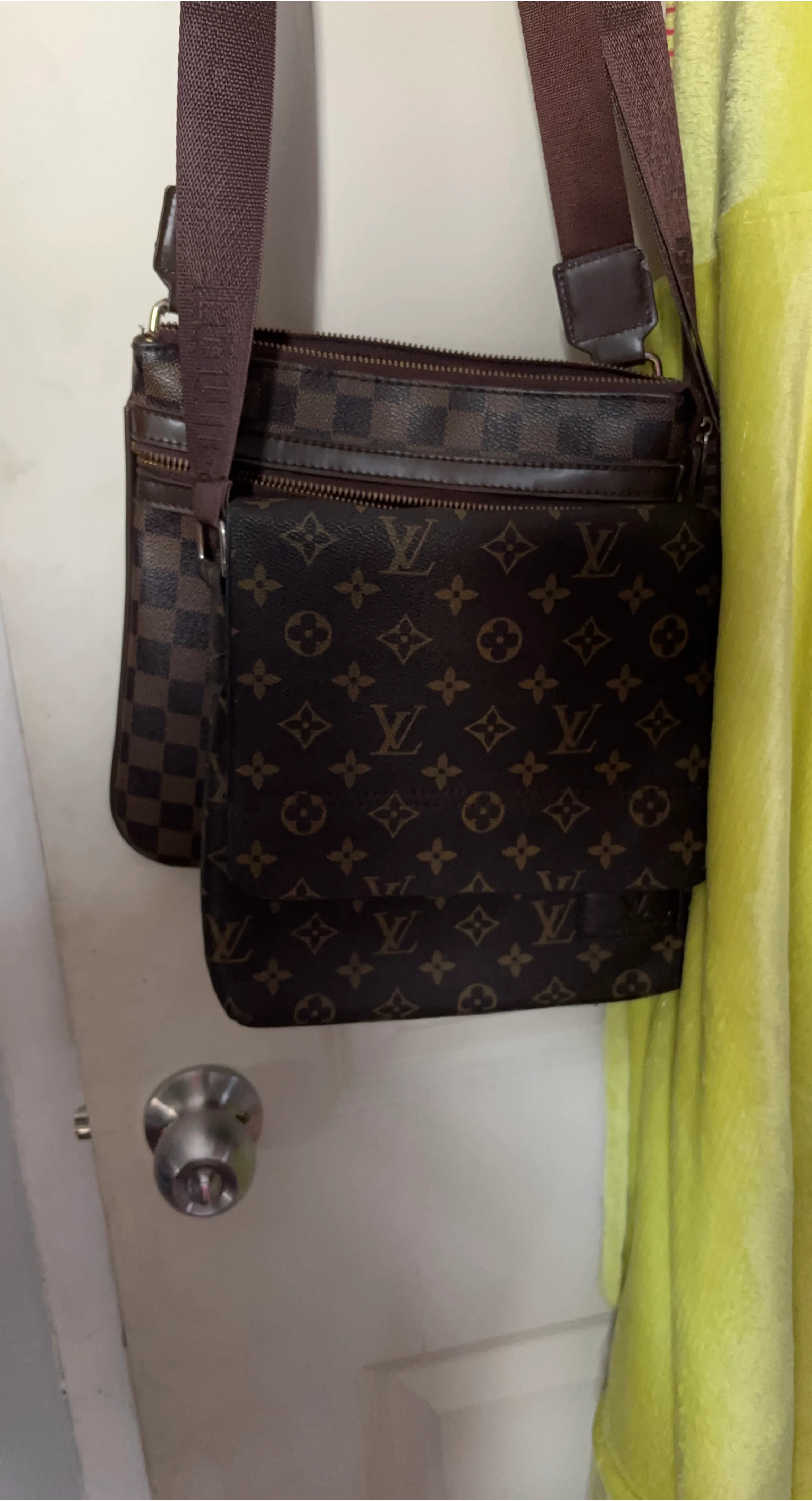 This is a Louis Vuitton crossbody bag with the iconic monogram and Damier patterns. It features multiple zippered compartments for organization. Its practical design makes it great for everyday use.