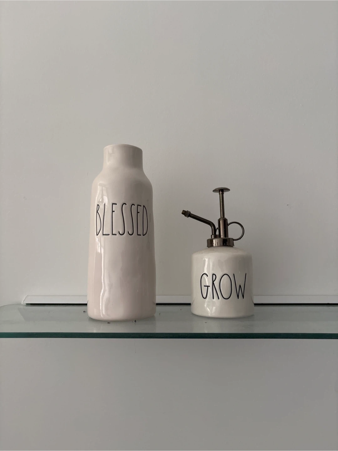 This set includes a Rae Dunn "Blessed" vase and a "Grow" plant mister. Both are made of ceramic. They're perfect for adding a touch of farmhouse charm to your home decor.