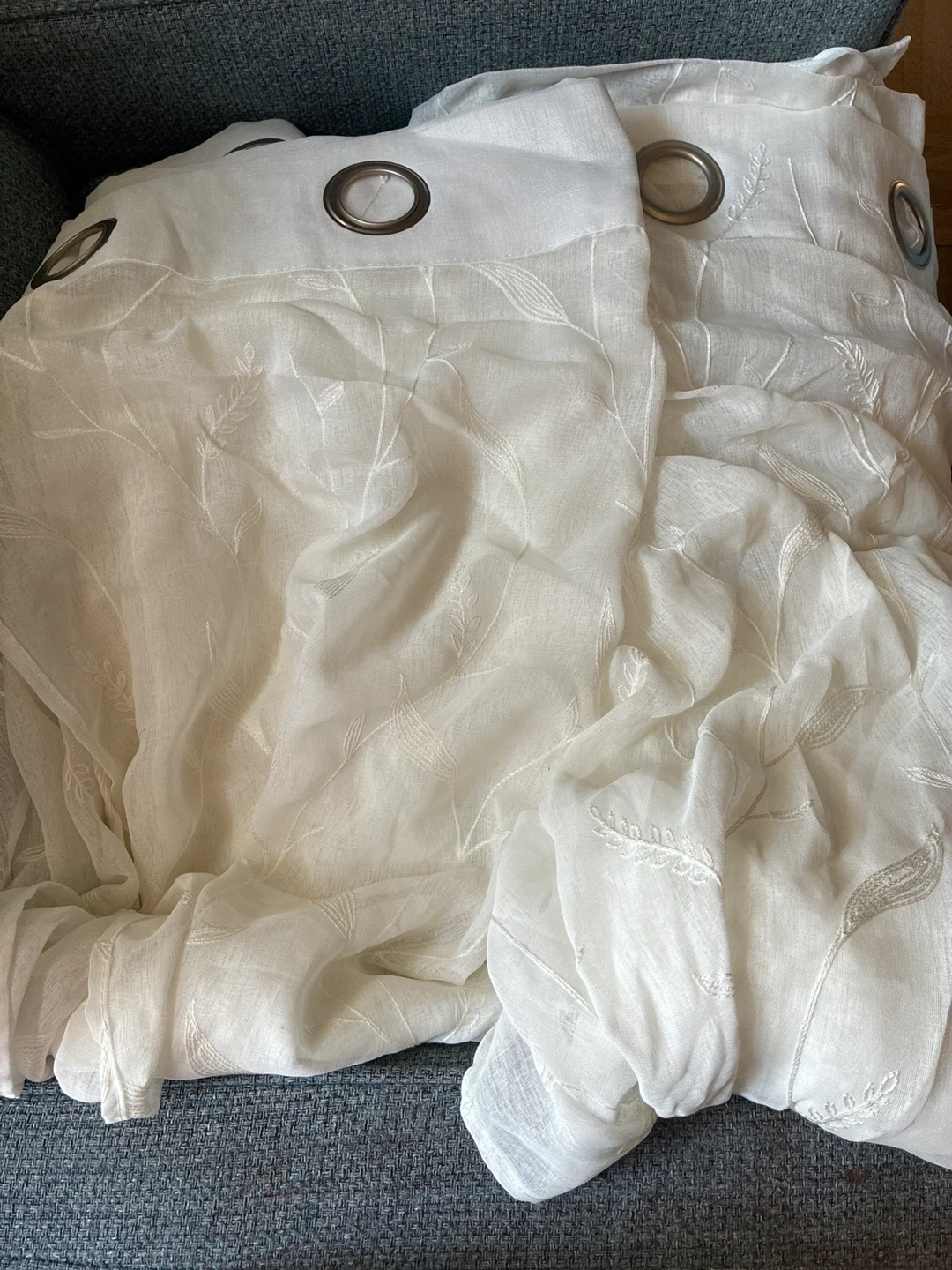 White sheer curtains with embroidered leaf pattern. These curtains feature grommets for easy hanging. They're made of a lightweight fabric that lets in natural light. The curtains are almost the same size as a bathroom curtain, measuring 70+72 inches. They’re pet-free and smoke-free.