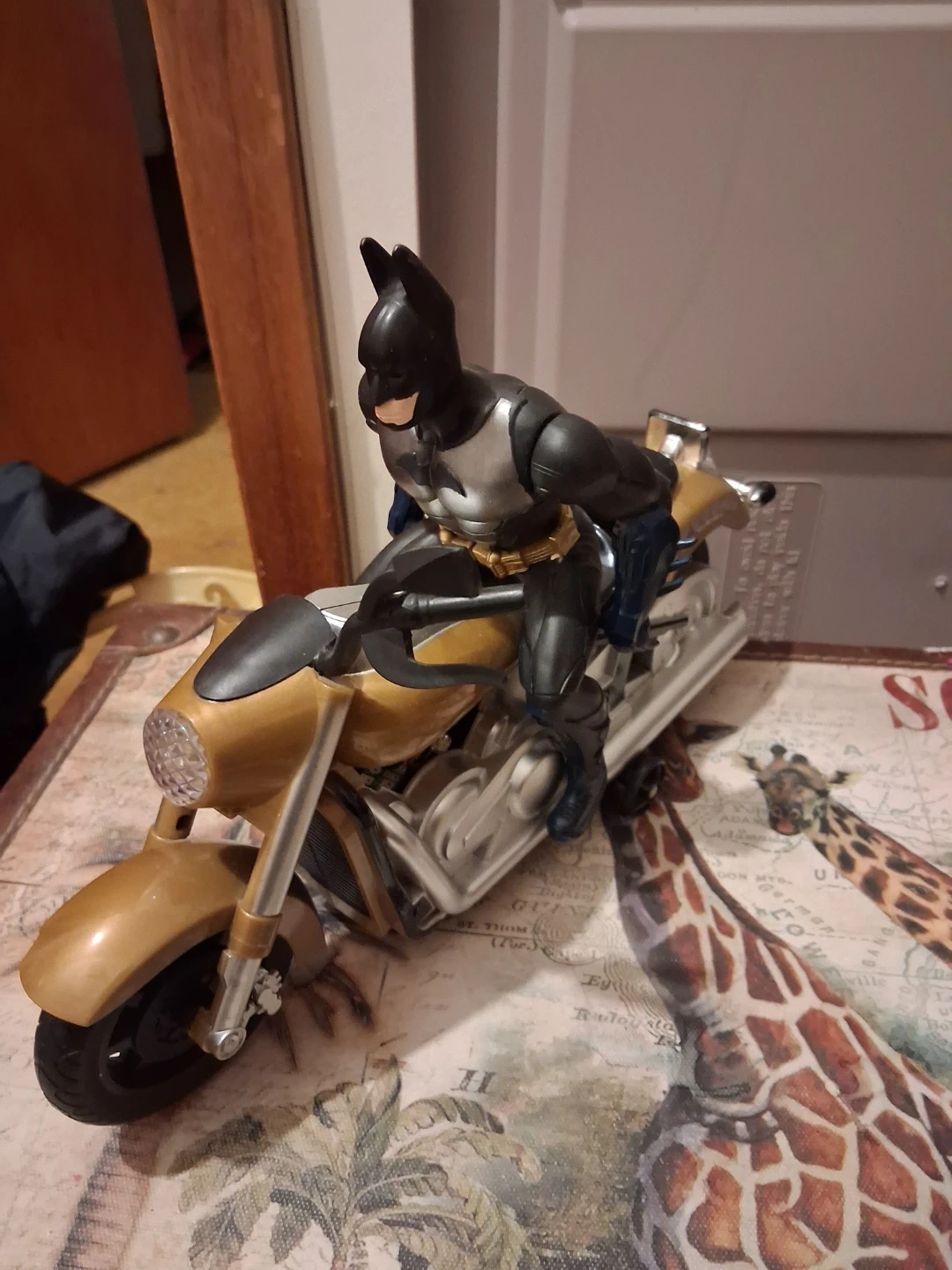 This is a Batman action figure riding a gold and silver motorcycle. The figure is articulated, and the motorcycle has rolling wheels. It's a fun toy for any Batman fan!