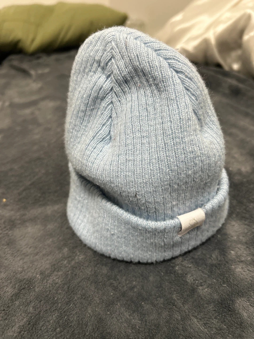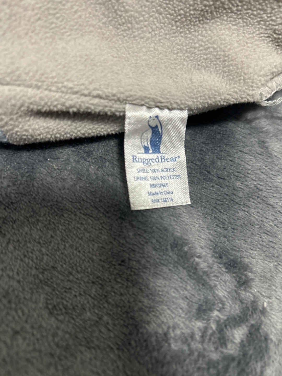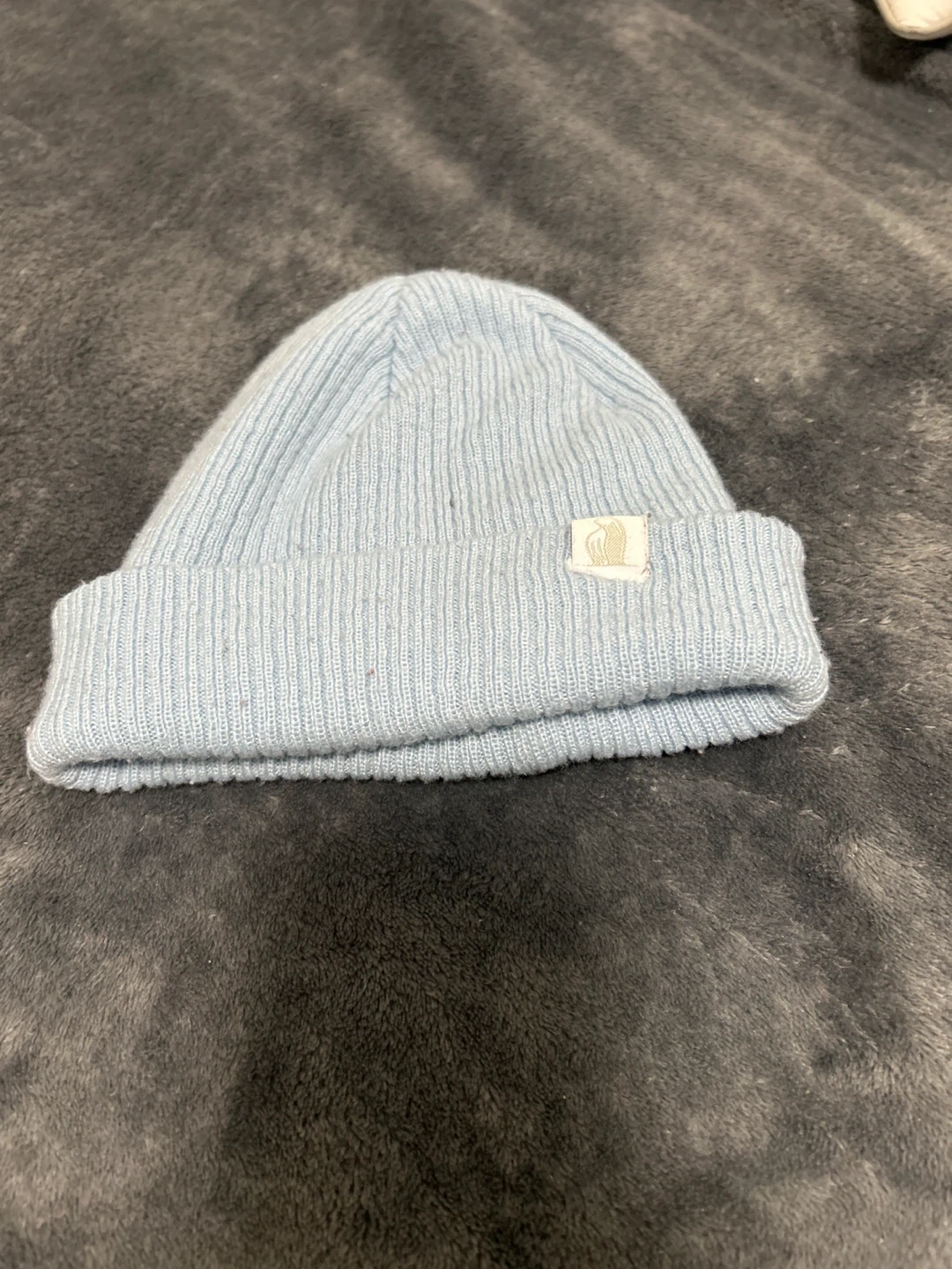 This is a baby blue knit beanie from Rugged Bear. Shell is 100% acrylic with a 100% polyester lining. Made in China. It's perfect for keeping little ones warm!