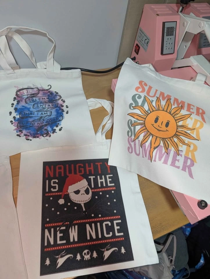 Brand new tote bags, with sublimation images. Great as a gift, or to give gifts in! $10.00 each. Buying more than 1, take $1 off each additional tote bag (e.g., 2 bags = $18, 3 bags = $27). Pickup near Londonderry mall.