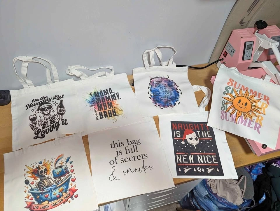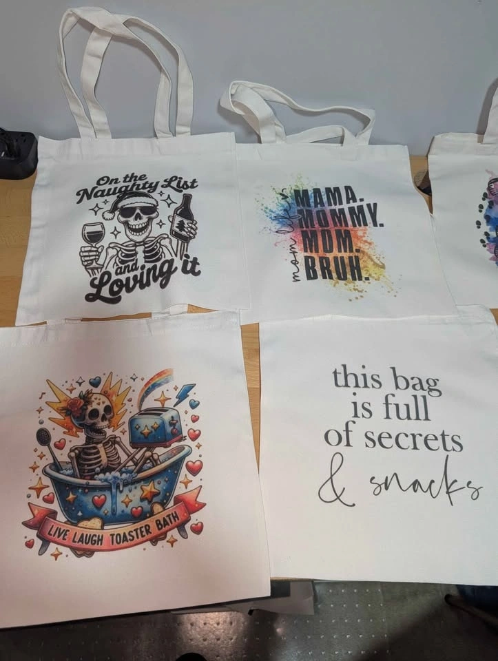 Brand new tote bags, with sublimation images. Great as a gift, or to give gifts in! $10.00 each. Buying more than 1, take $1 off each additional tote bag (e.g., 2 bags = $18, 3 bags = $27). Pickup near Londonderry mall.