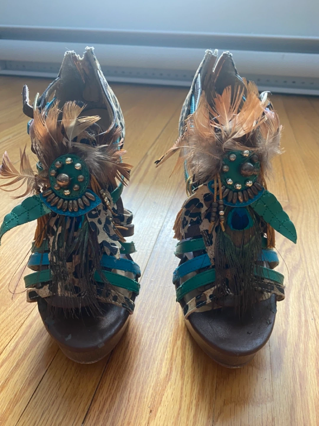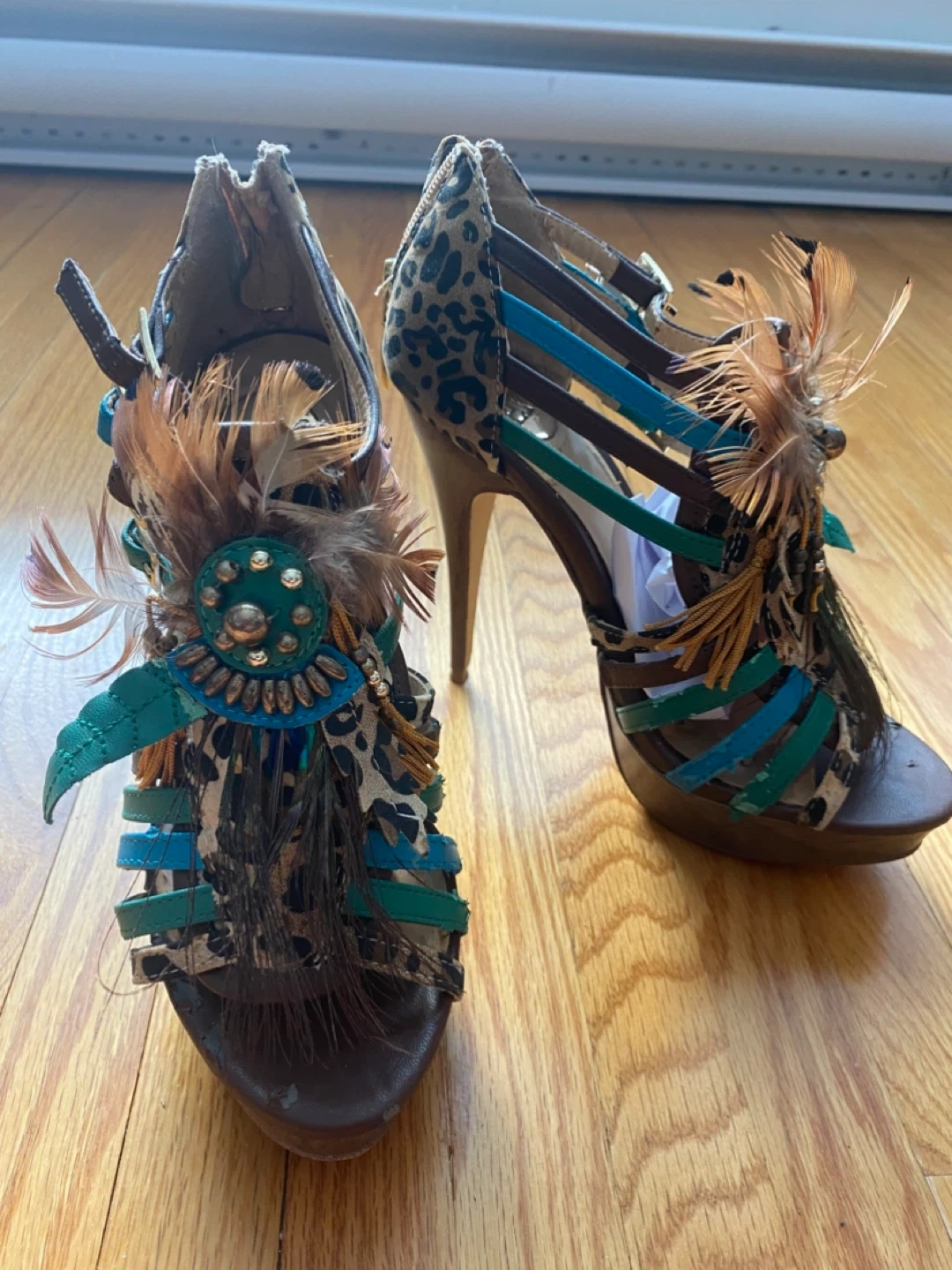 These statement heels feature a wild leopard print with vibrant turquoise and brown straps. Embellished with feathers and tassels, they add a bold touch to any outfit!