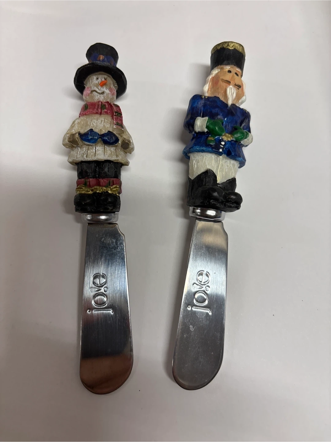 Set of two butter knives with decorative handles. One features a snowman design and the other a nutcracker. Stainless steel blades. Fun for holiday entertaining!