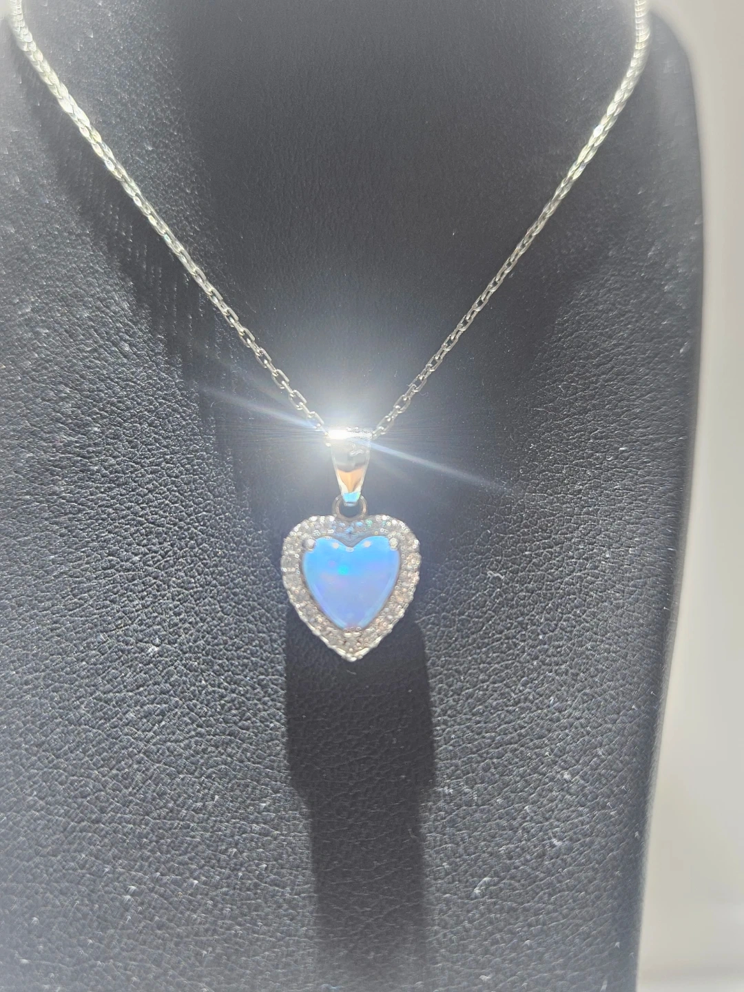 Beautiful heart-shaped pendant necklace and matching earrings, each featuring a vibrant blue opal centre surrounded by sparkling diamonds. This elegant set adds a touch of charm to any outfit. Crafted with sterling silver.