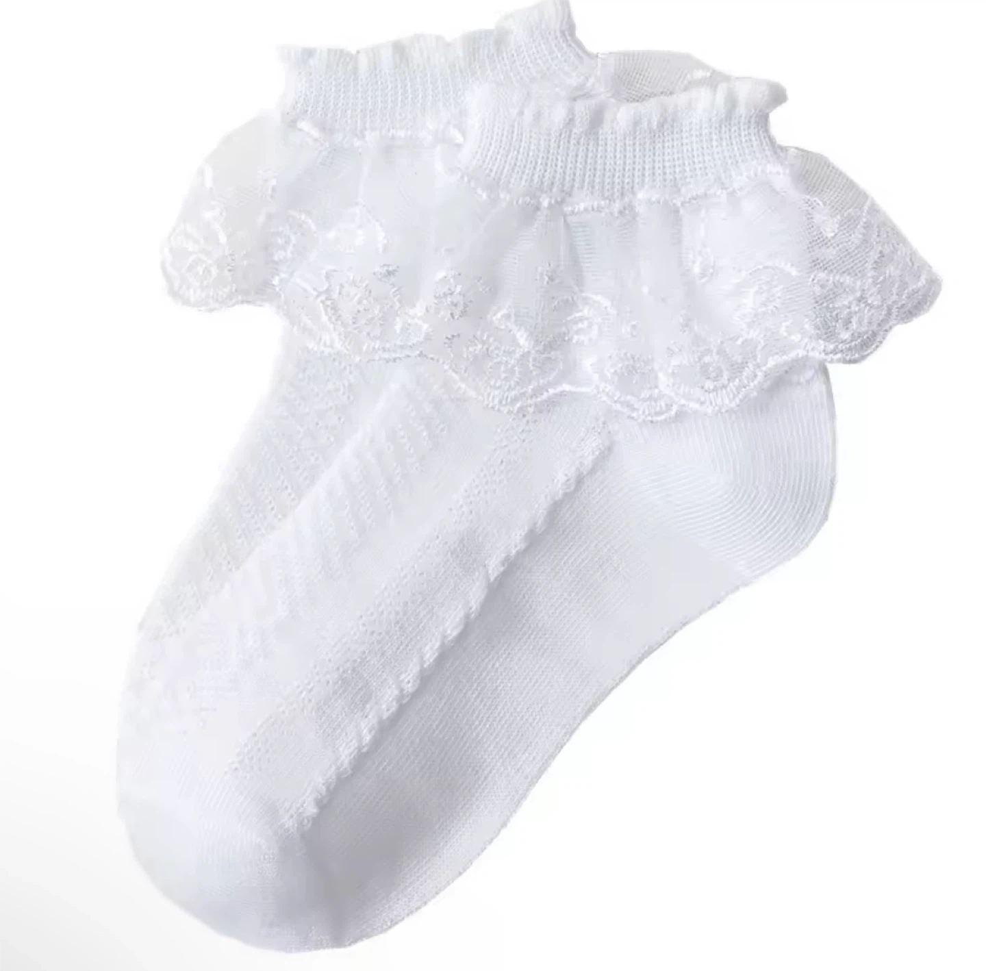 Adorable white ankle socks with a ruffled lace trim. These socks are soft and comfortable. They're perfect for dressing up an outfit!