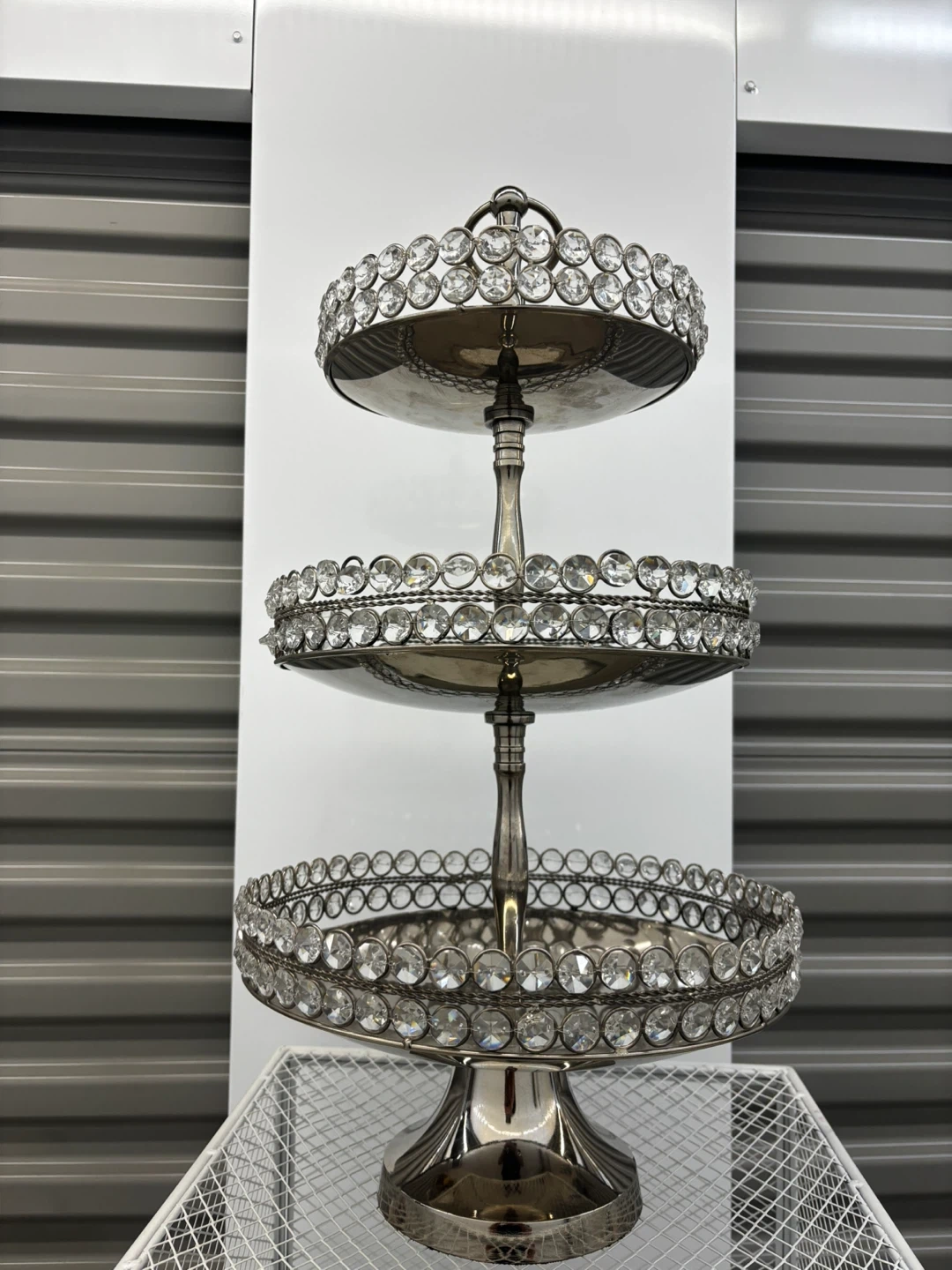 This elegant 3-tier serving stand features shimmering crystal embellishments on each tray. It's constructed from durable metal with a polished silver finish. This stand is perfect for displaying cupcakes, appetizers, or desserts at parties and special occasions!