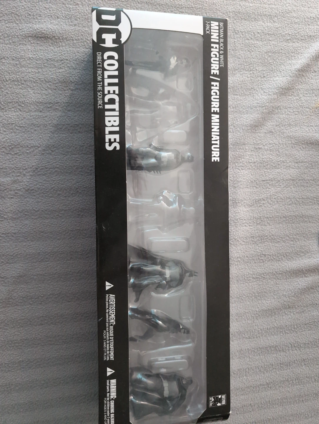 This is a 7-pack of DC Collectibles Batman Black & White mini figures. The figures are black and white and come in a display box. For ages 3 and up. 2 figures missing. Selling cheap