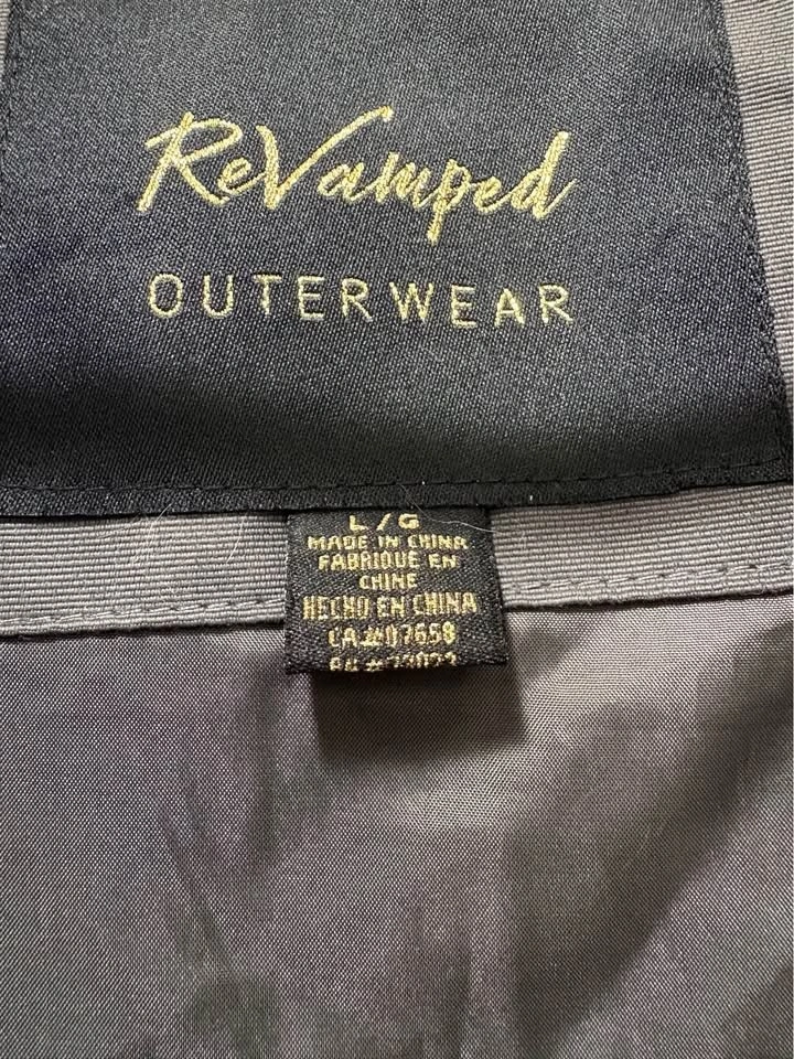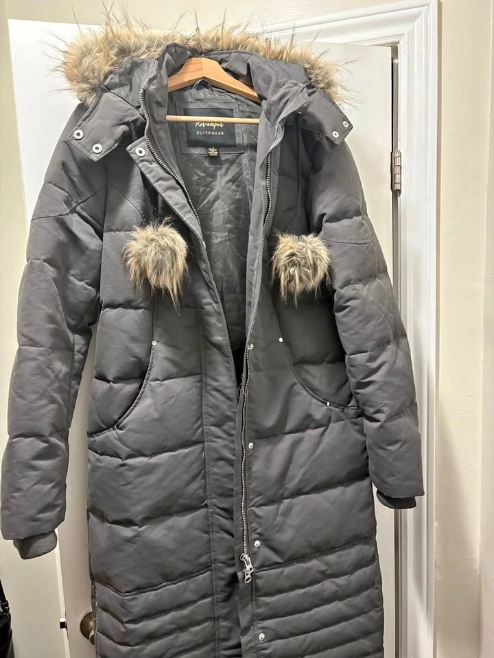 Warm and stylish Revamped Outerwear long puffer winter coat in charcoal grey. Features a cozy insulated design with a faux-fur trimmed hood, zip and snap front closure, and deep pockets. Perfect for cold winter days. Condition: Very good pre-owned. Clean and well cared for. Fur trim is full and intact. No rips, holes, or stains noted. Details: Brand: Revamped Outerwear. Size: Large (L). Colour: Charcoal / Dark Grey. Long length, quilted puffer style.