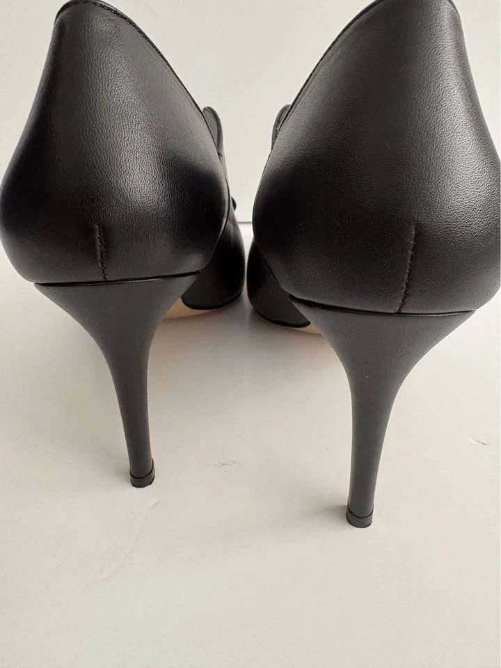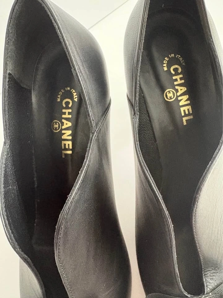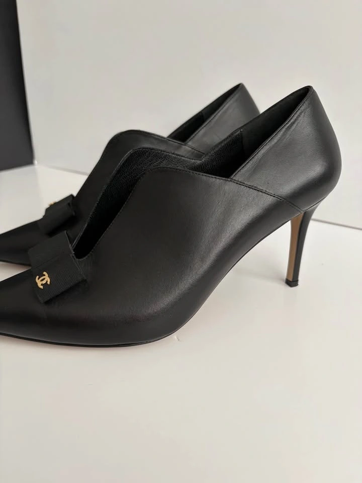 Authentic Chanel black leather pumps featuring the iconic CC logo bow detail. Elegant pointed toe with a classic stiletto heel — timeless, polished, and unmistakably Chanel. Made in Italy with beautiful quality leather and a sleek silhouette. These are a sophisticated wardrobe staple for work, events, or evening wear. Condition: Very good pre-owned. Light wear on soles only (shown in photos). Only worn inside, no outerwear. Leather uppers are clean and well maintained. Heels are straight and sturdy. Brand: Chanel. Size: EU 41 (fits approx. US Women’s 10). Colour: Black. Material: Leather. Made in Italy, brought home from a trip as a gift but were too small. Authentic (branding & stamps shown in photos). The shoes were easier to bring in a suitcase. $400 firm. Low offers will be politely declined. If the ad is up it’s available. Only serious inquiries please.