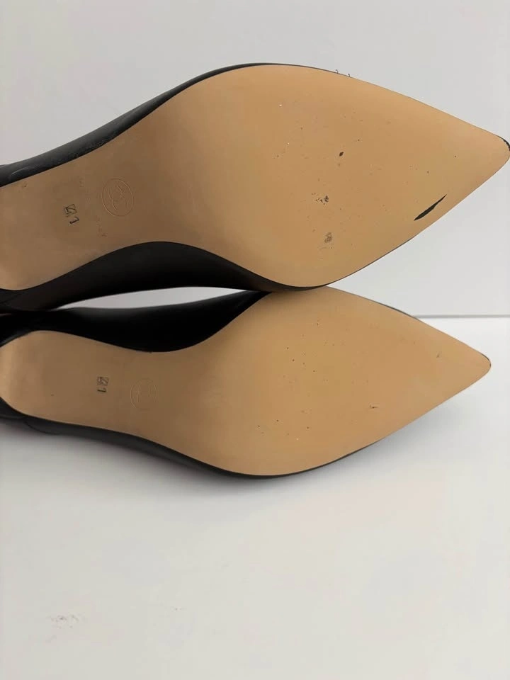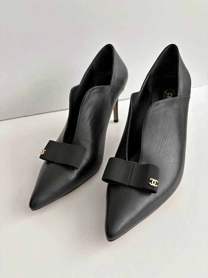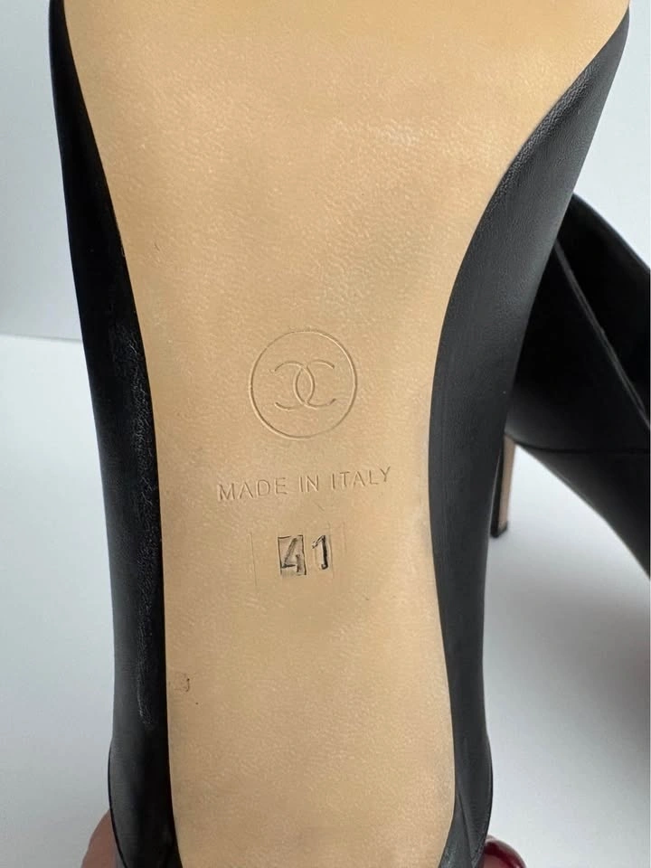 Authentic Chanel black leather pumps featuring the iconic CC logo bow detail. Elegant pointed toe with a classic stiletto heel — timeless, polished, and unmistakably Chanel. Made in Italy with beautiful quality leather and a sleek silhouette. These are a sophisticated wardrobe staple for work, events, or evening wear. Condition: Very good pre-owned. Light wear on soles only (shown in photos). Only worn inside, no outerwear. Leather uppers are clean and well maintained. Heels are straight and sturdy. Brand: Chanel. Size: EU 41 (fits approx. US Women’s 10). Colour: Black. Material: Leather. Made in Italy, brought home from a trip as a gift but were too small. Authentic (branding & stamps shown in photos). The shoes were easier to bring in a suitcase. $400 firm. Low offers will be politely declined. If the ad is up it’s available. Only serious inquiries please.