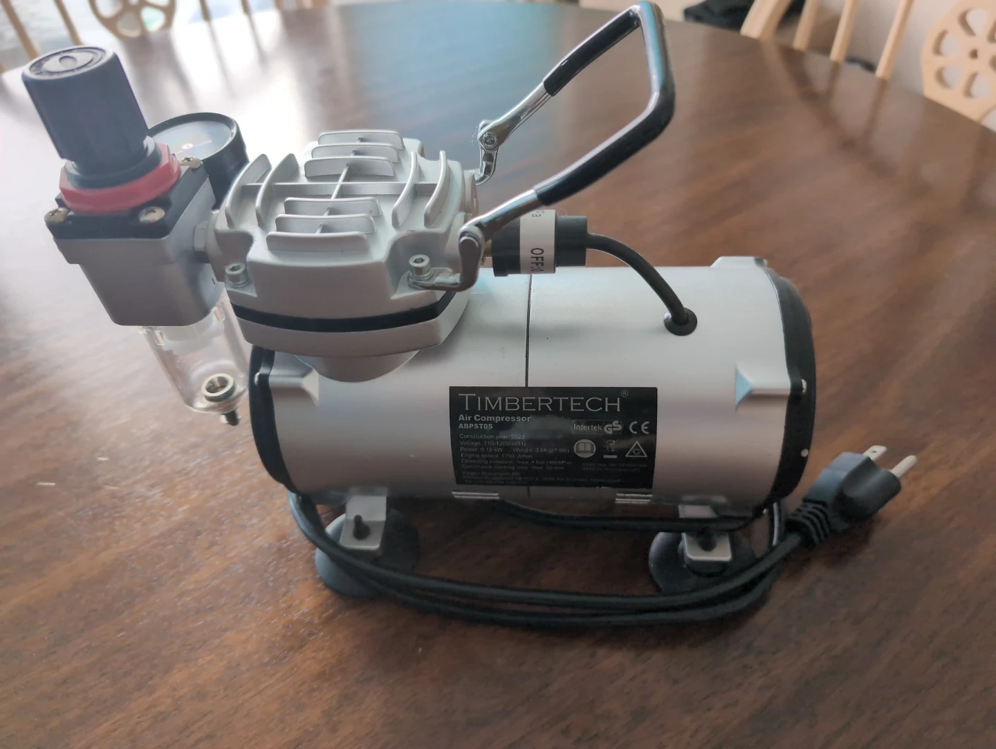 Timbertech air compressor, model ABPST05. Voltage 110-120V/60Hz and 0.15 kW power. Constructed in 2022 with an engine speed of 1700rpm.
