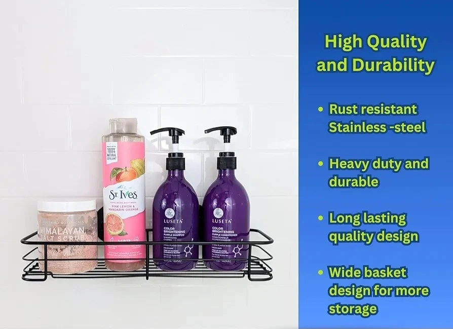 This suction cup shower caddy shelf is made from stainless steel for durability and rust resistance. It features easy installation with no tools or drilling needed, supporting up to 10 pounds. Its dimensions are 14.96 inches wide, 4.33 inches deep, and 2.36 inches tall. This is useful for organizing bathroom essentials.