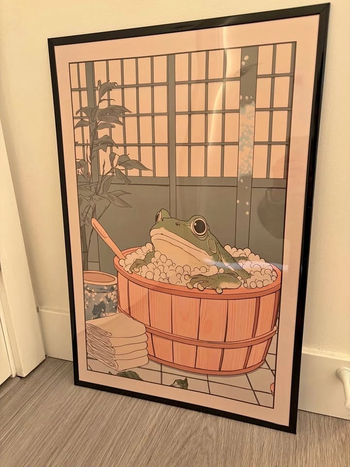16” x 24” wall print poster of a frog in an onsen, printed on canvas. The frame is ready to be hung. Perfect washroom decor!