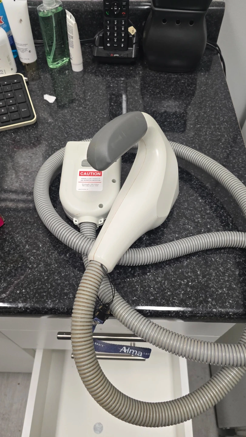 This is a handpiece for an Alma laser system. It's connected via a grey hose and has a caution label regarding proper eye protection. Ideal for professional aesthetic treatments.