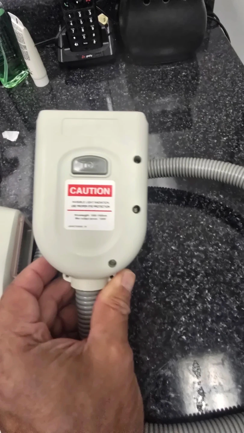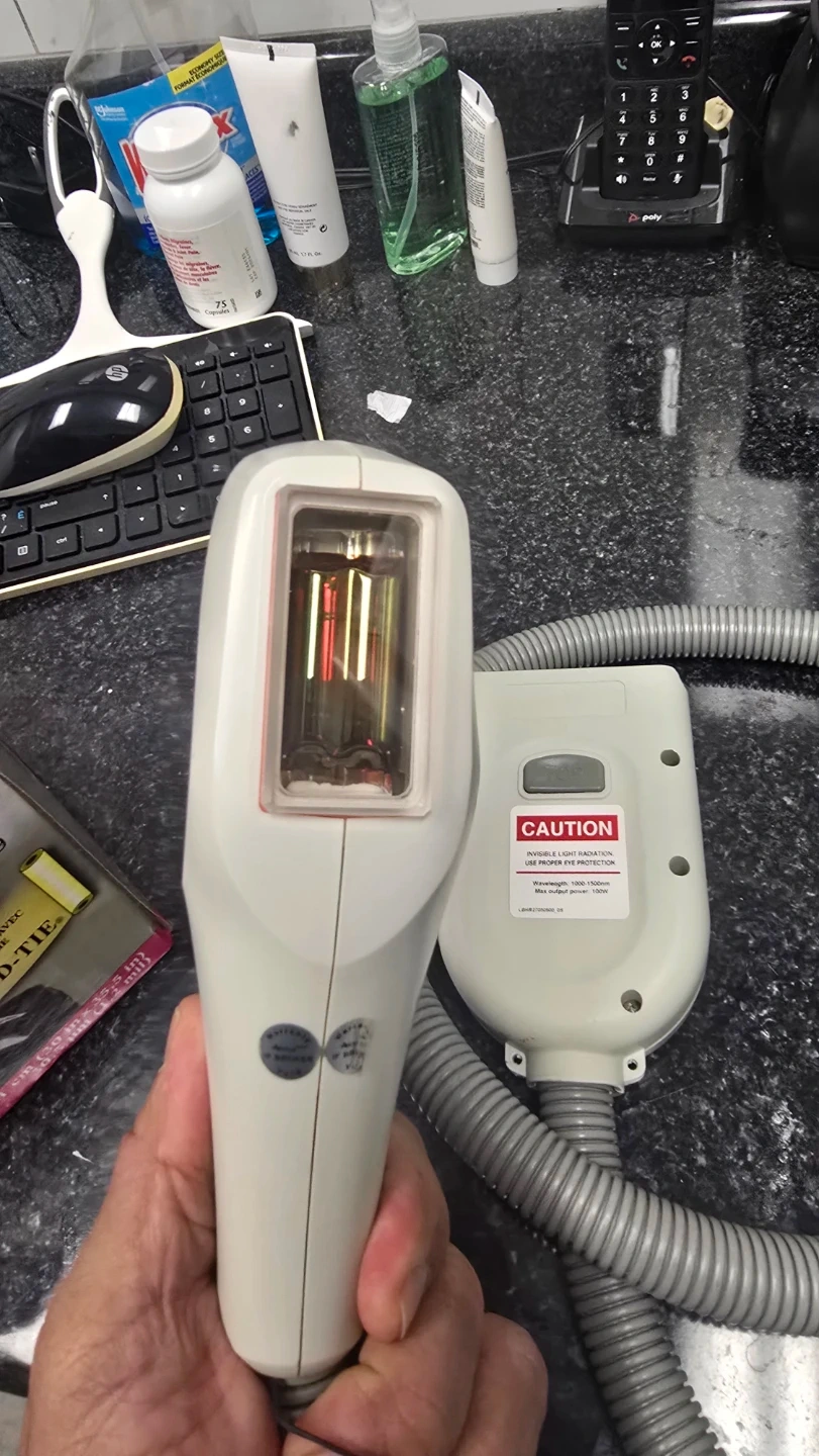 This is a handpiece for an Alma laser system. It's connected via a grey hose and has a caution label regarding proper eye protection. Ideal for professional aesthetic treatments.