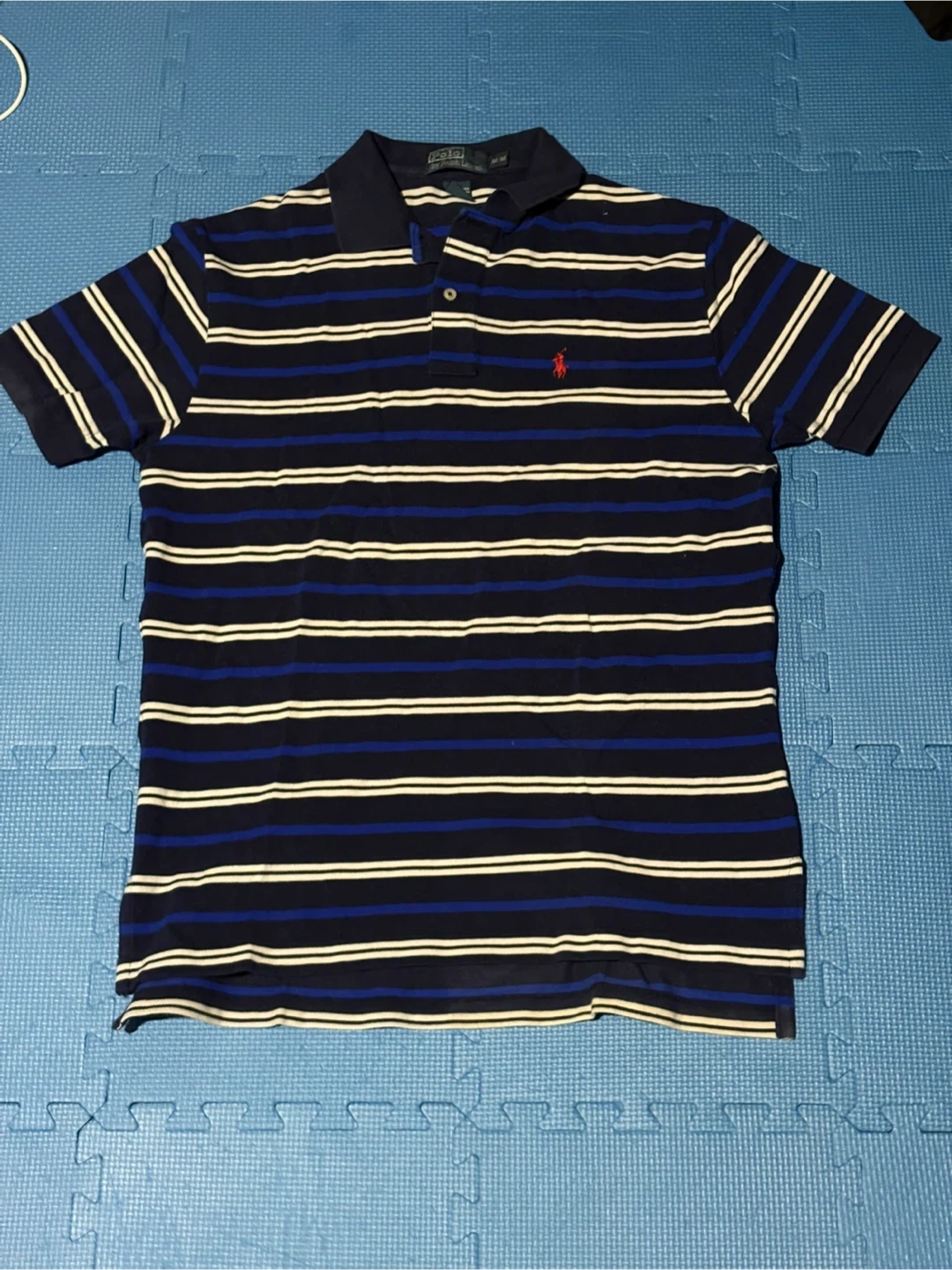 Navy blue Polo Ralph Lauren polo shirt with white and royal blue stripes. Features the signature red embroidered pony logo. Size is M/M.