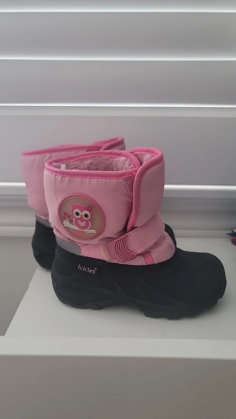 Toddler winter boots in pink with an owl decal. Features a fuzzy lining and velcro closure. These boots are great for keeping little feet warm and dry during colder weather. Size 10