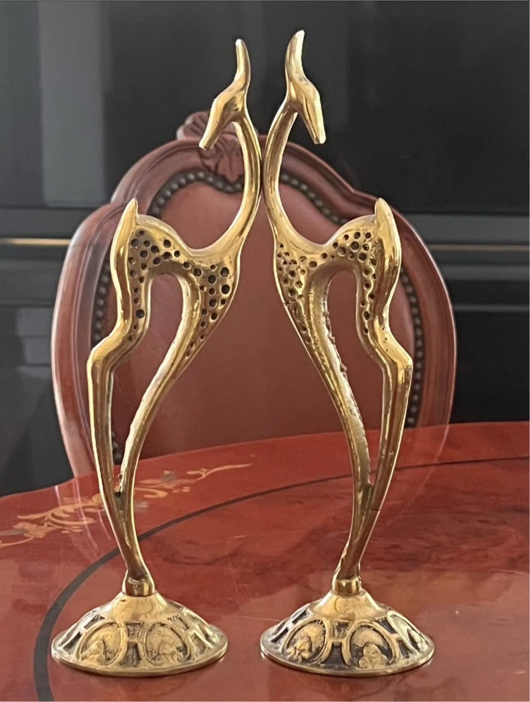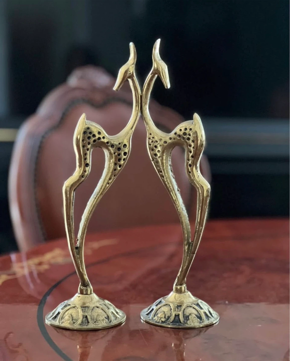 A pair of decorative brass figurines shaped like deer. Each figurine stands on a patterned base with intricate cutouts. These elegant pieces add a touch of vintage charm to any decor.
