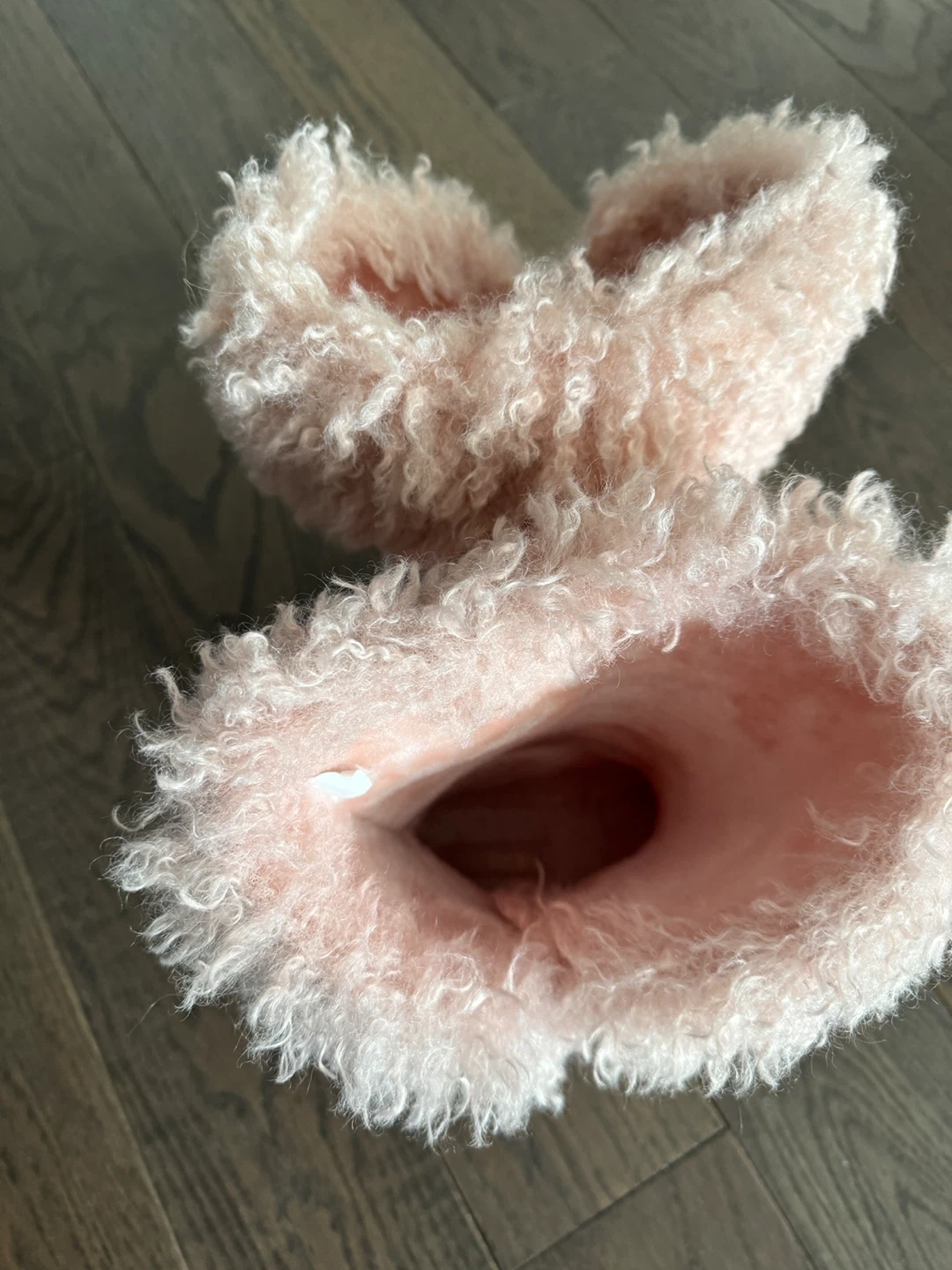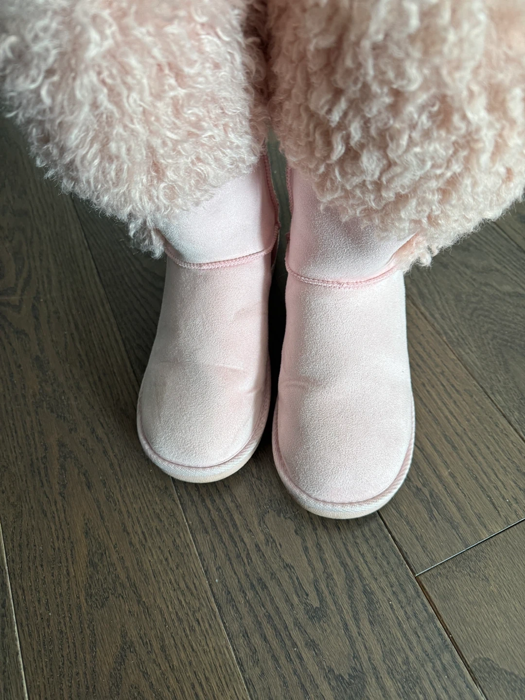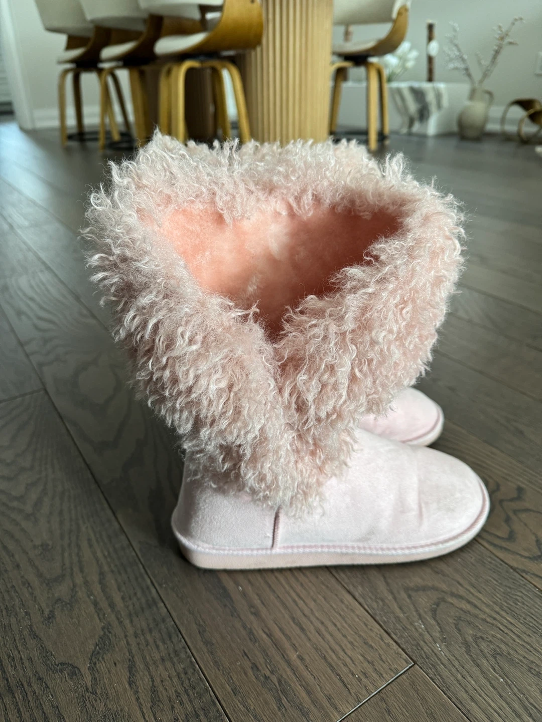 Cozy pink boots with fluffy faux fur lining for warmth. These are perfect for keeping your feet toasty during colder months.