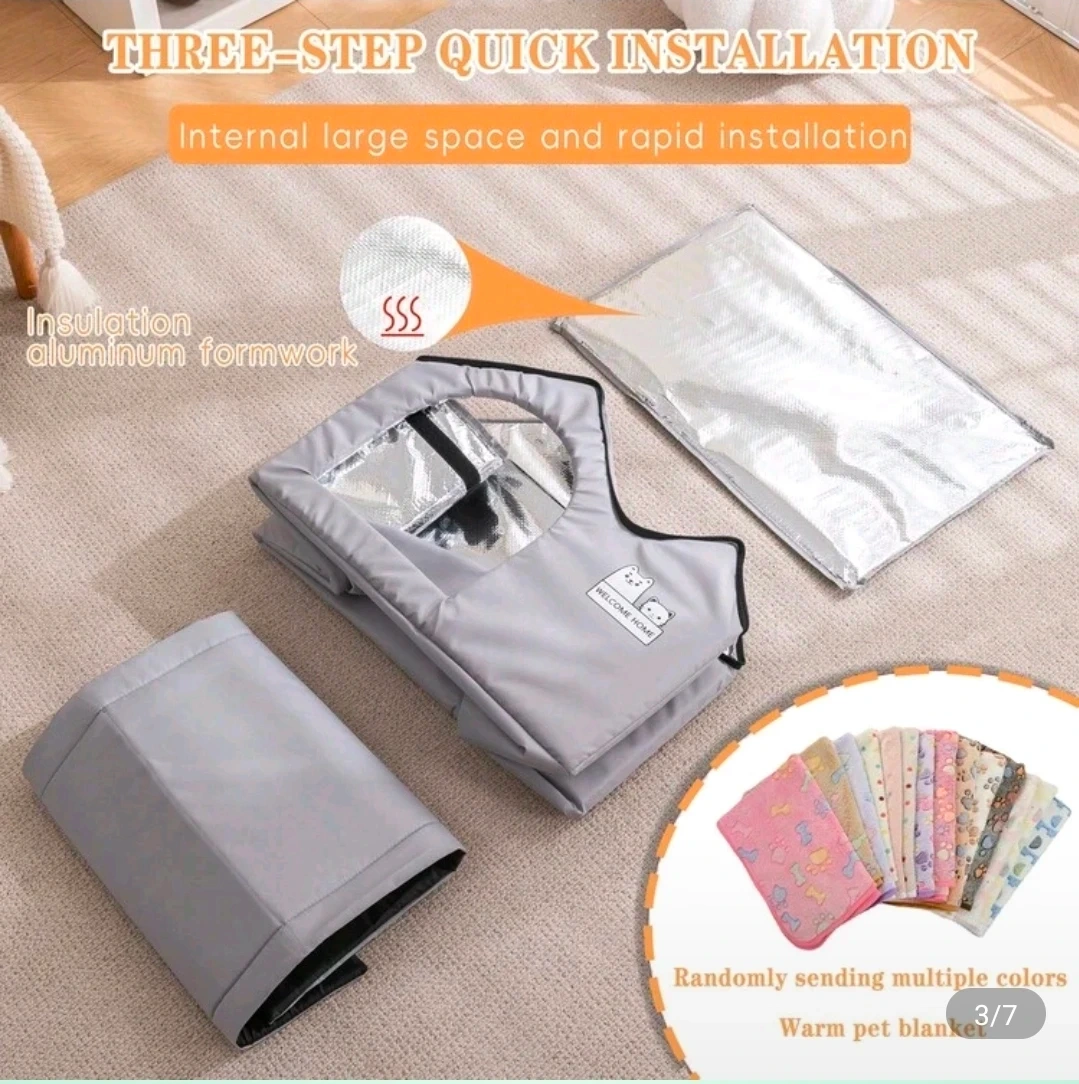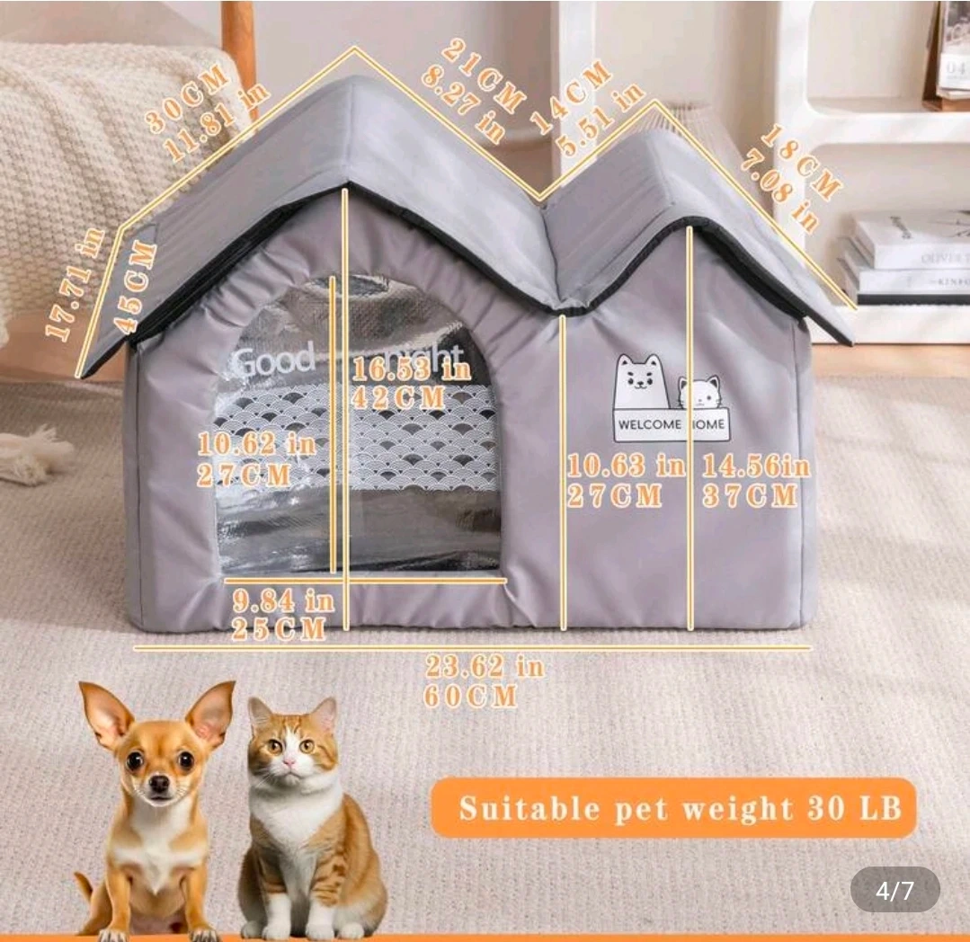 This grey insulated pet house is perfect for keeping your furry friend cozy. It's made with insulation aluminum formwork for warmth. The house is suitable for small to medium sized pets weighing up to 30 LB. It is foldable, easy to install in four quick steps!