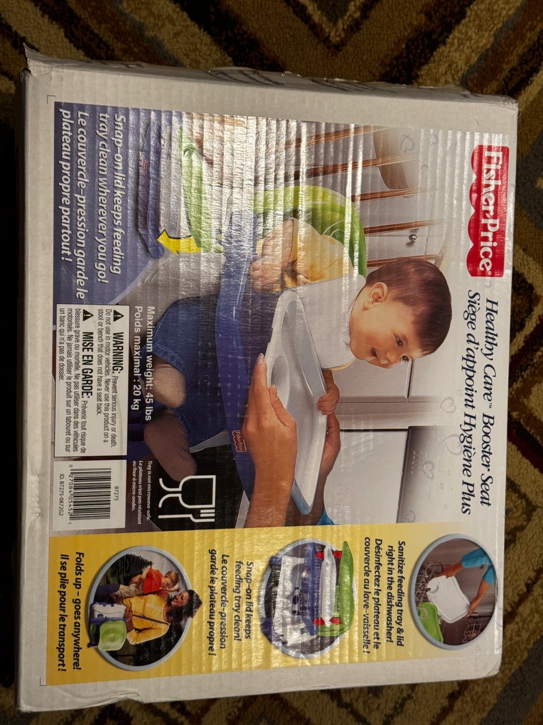 Fisher-Price Healthy Care Booster Seat with a snap-on lid to keep the feeding tray clean. The feeding tray and lid are dishwasher safe. It folds up for easy transport and supports a maximum weight of 45 lbs. The tray is not microwave-safe.