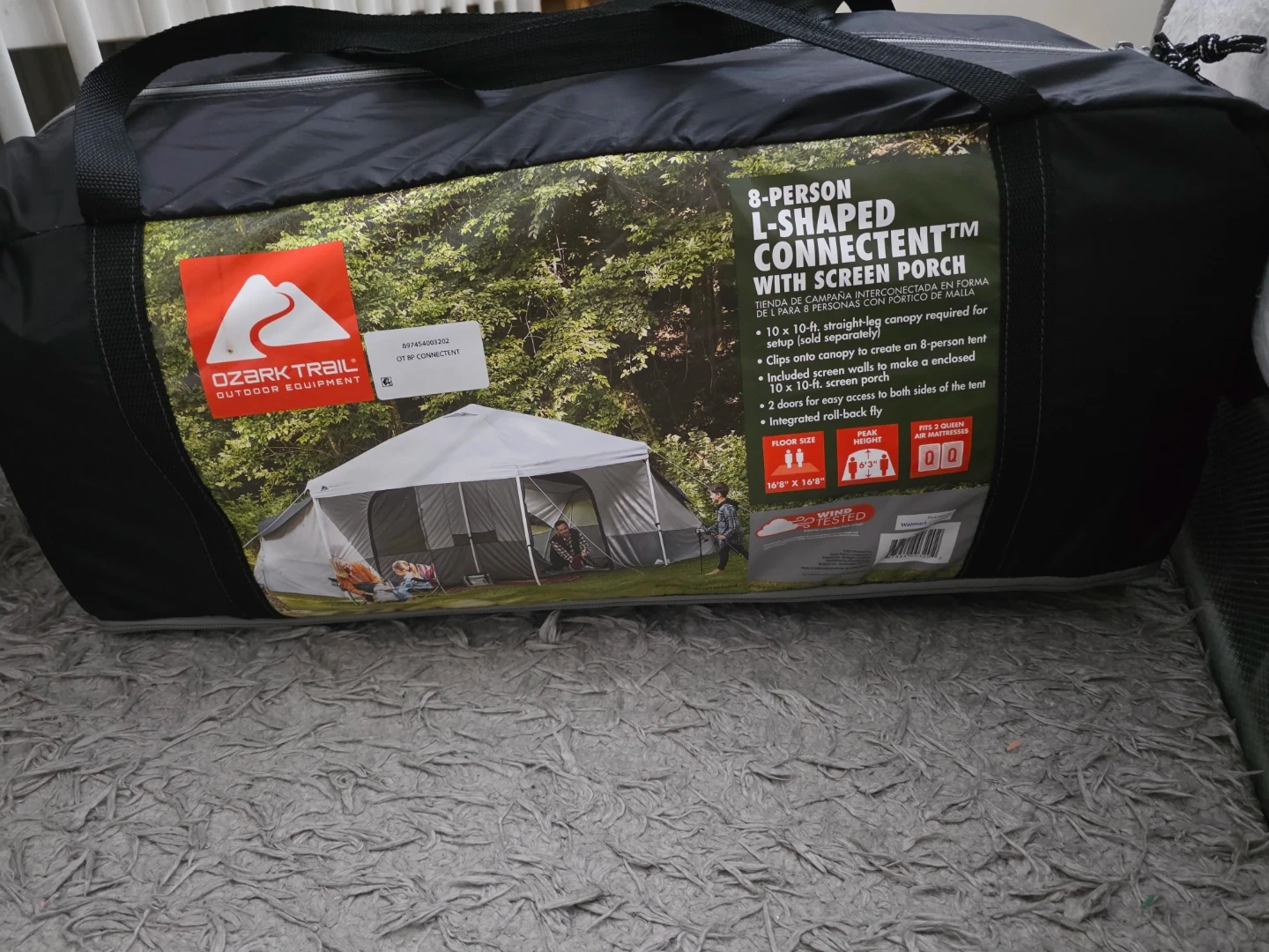 This Ozark Trail tent accommodates 8 people and features an L-shaped design with a screen porch. It's made with an integrated roll-back fly and has two doors for easy access. Floor size is 16'8" x 16'8" with a peak height of 6'3".