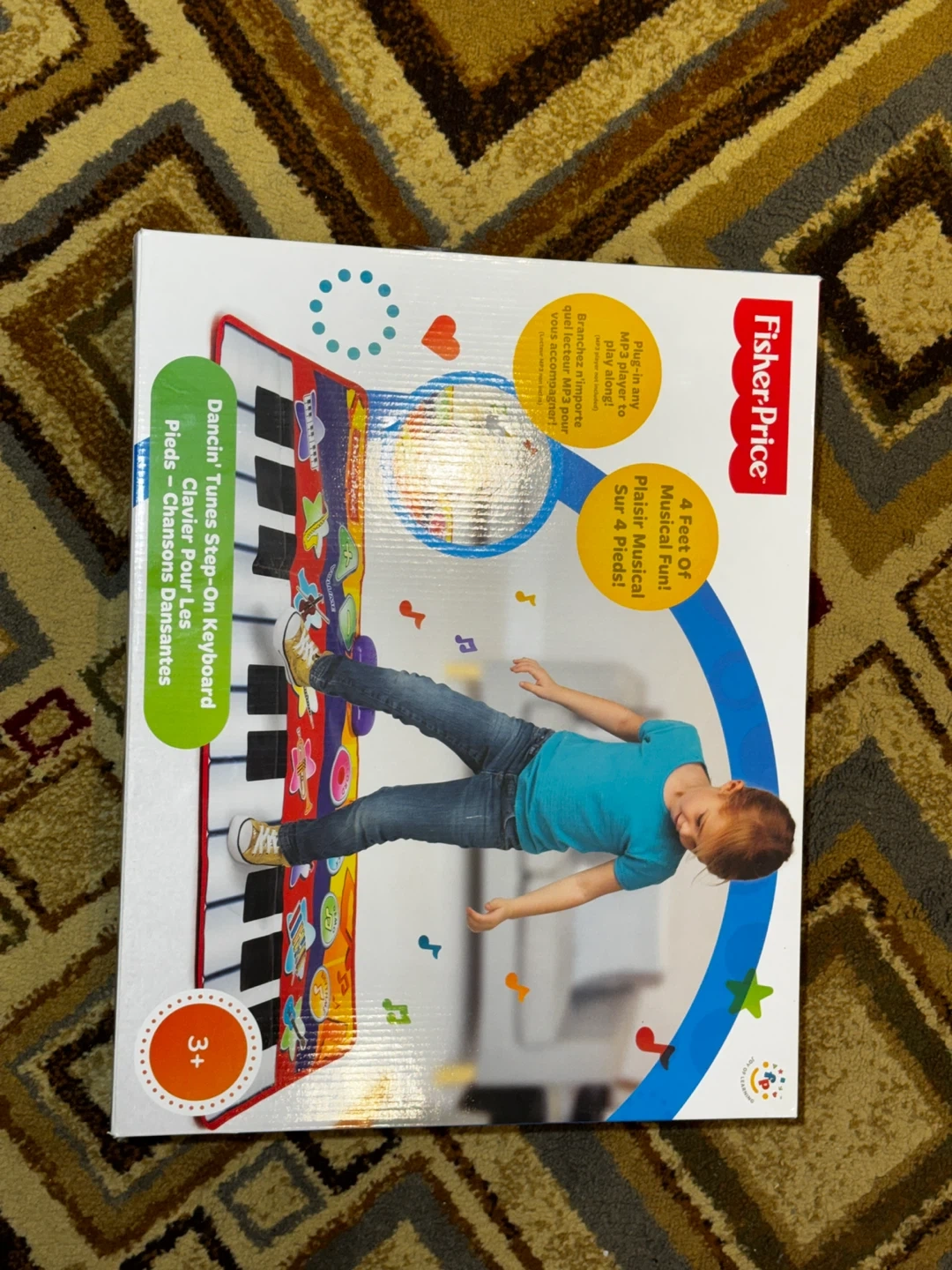 This Fisher-Price Dancin' Tunes Step-On Keyboard is 4 feet long! It lets you plug in any MP3 player to play along with your tunes. It's suitable for ages 3 and up.