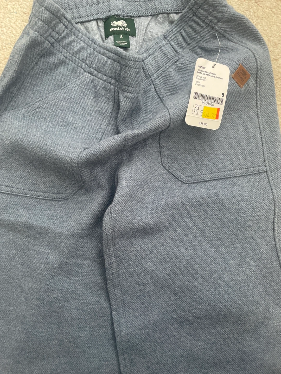 These are Roots kids' blue pants in size 8. They're made with recycled fibres. The pants have a comfortable, casual design.
