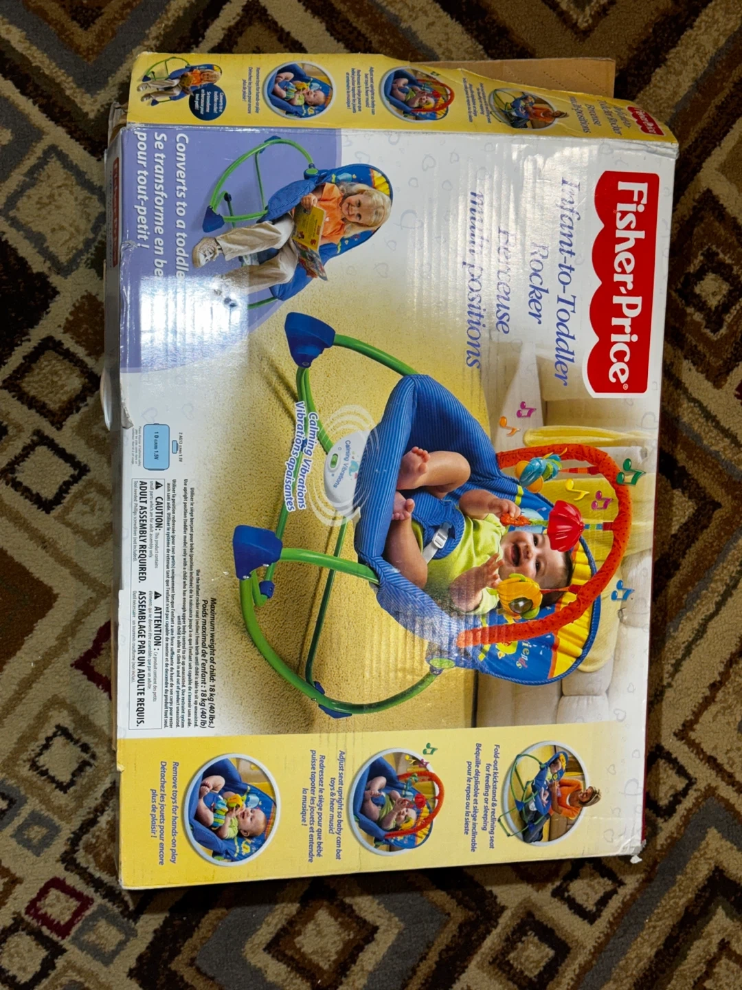This Fisher-Price Infant-to-Toddler Rocker converts from a baby rocker to a toddler rocker. It features calming vibrations and multiple positions for feeding or sleeping. The seat also adjusts upright so babies can play with the attached toys.