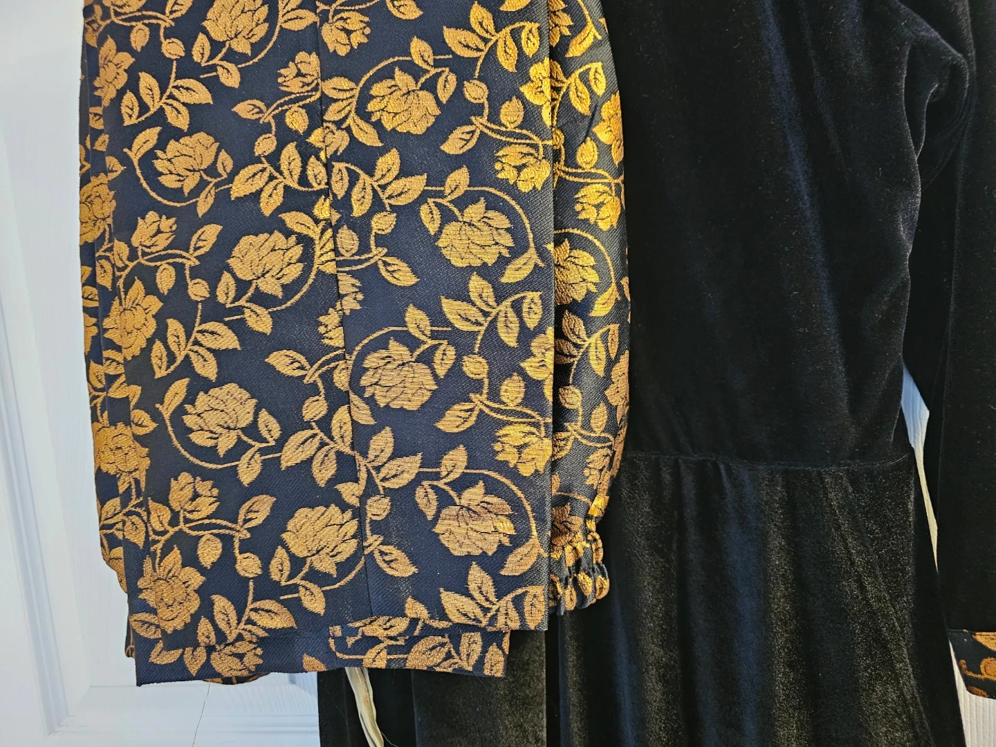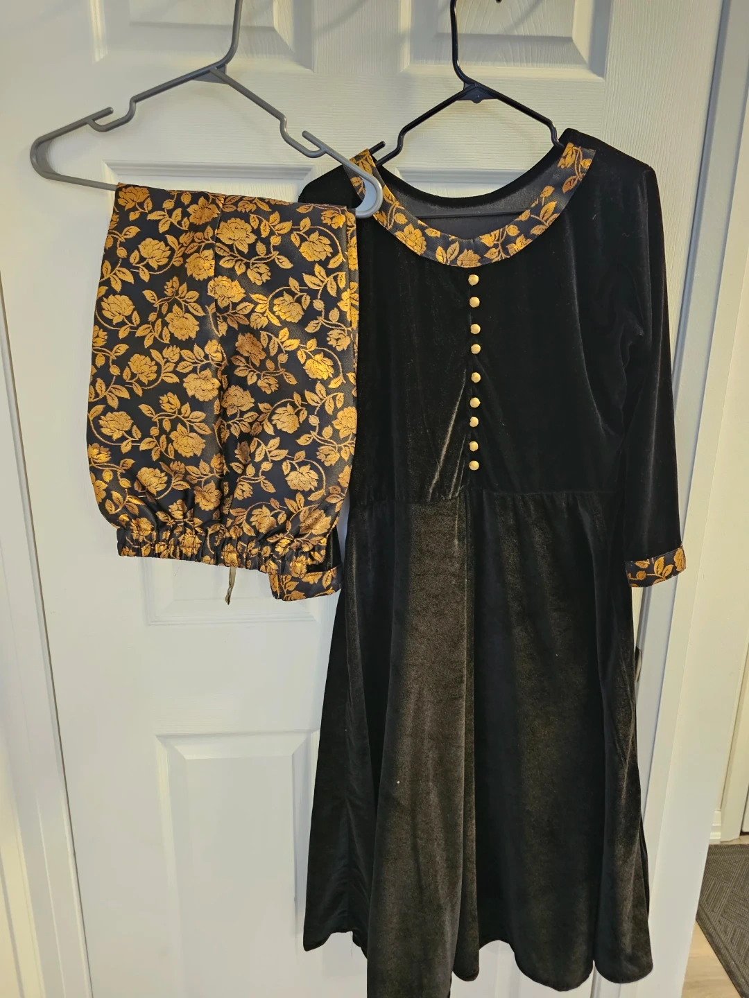 This is a black velvet dress with gold floral accents on the collar and cuffs. It includes matching pants with a gold floral print. The dress features gold-tone buttons down the front. It's a stylish two-piece set!