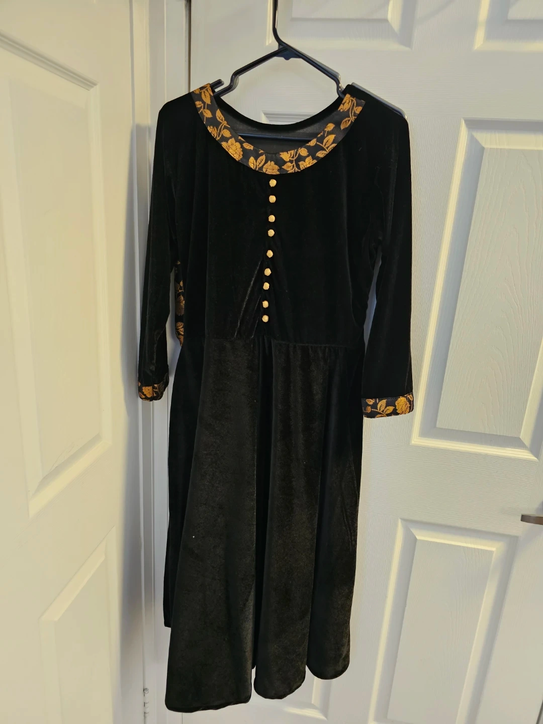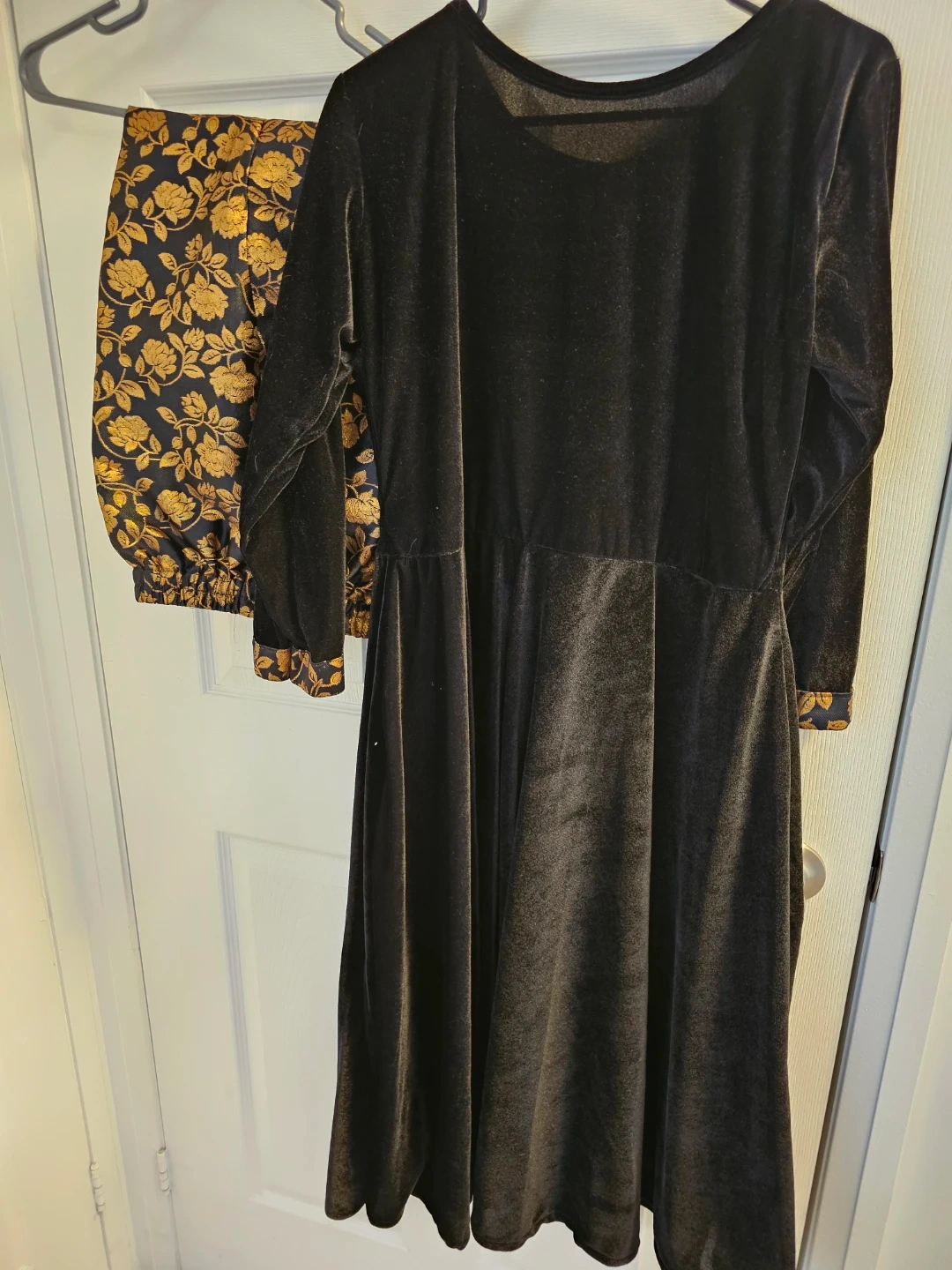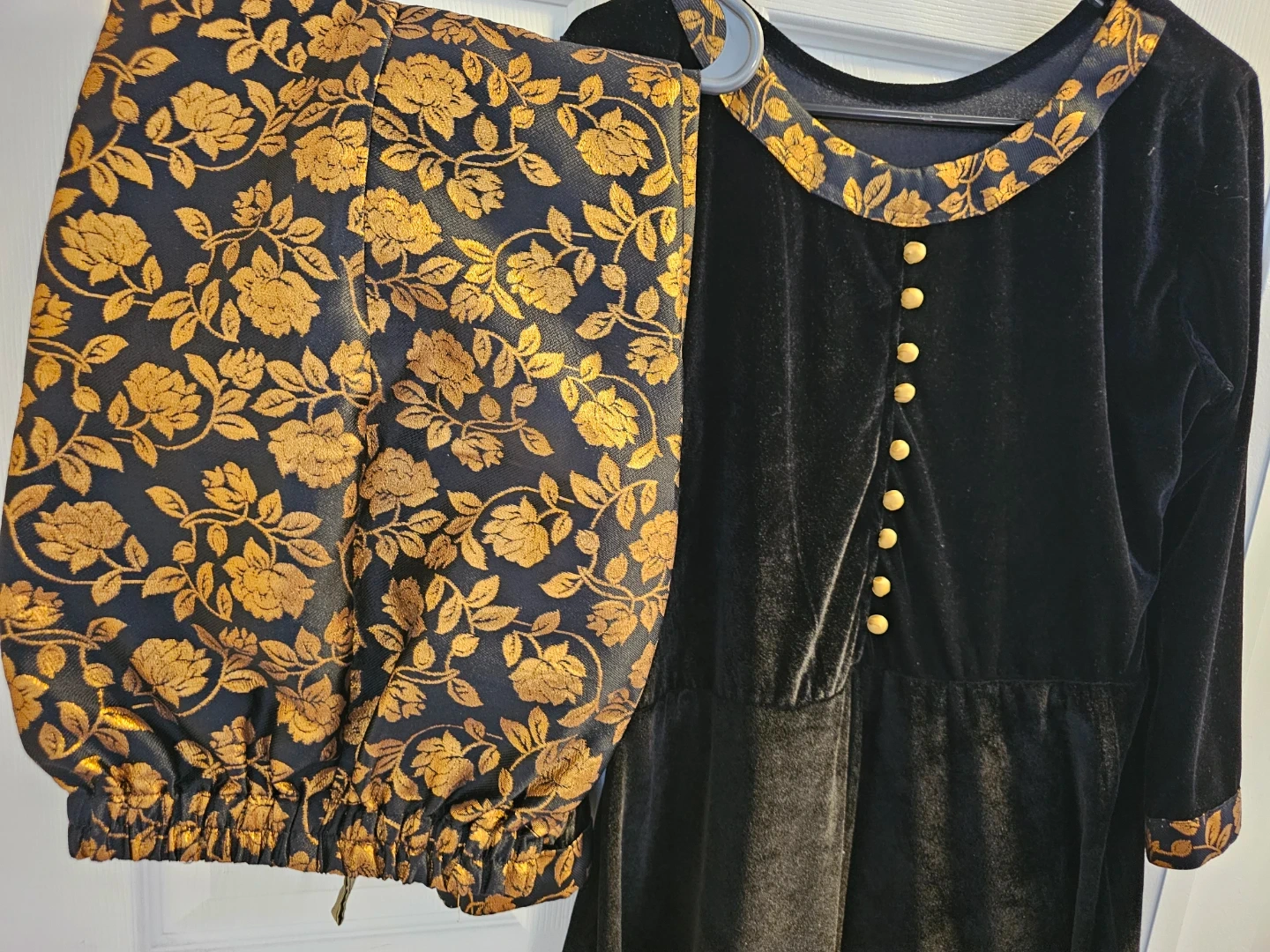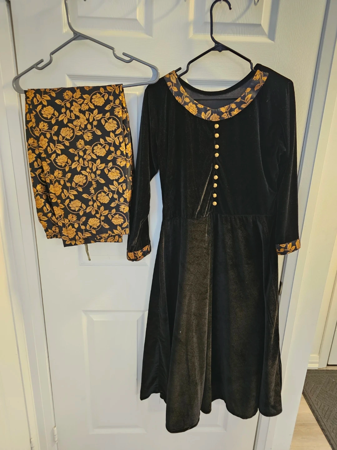 This is a black velvet dress with gold floral accents on the collar and cuffs. It includes matching pants with a gold floral print. The dress features gold-tone buttons down the front. It's a stylish two-piece set!