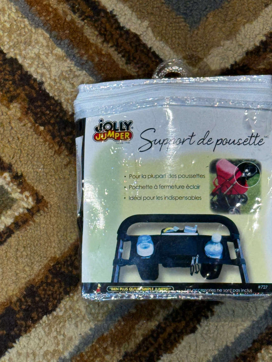 This is a Jolly Jumper stroller organizer, perfect for keeping your essentials handy. It has a zippered pouch and is designed for most strollers. Accessories are not included.