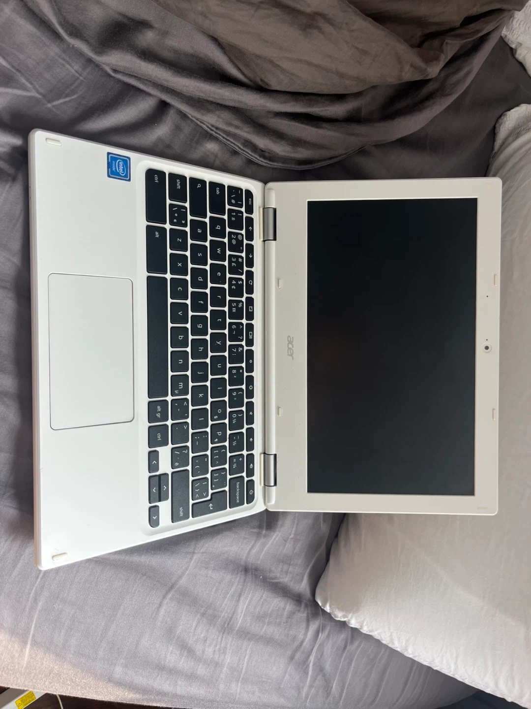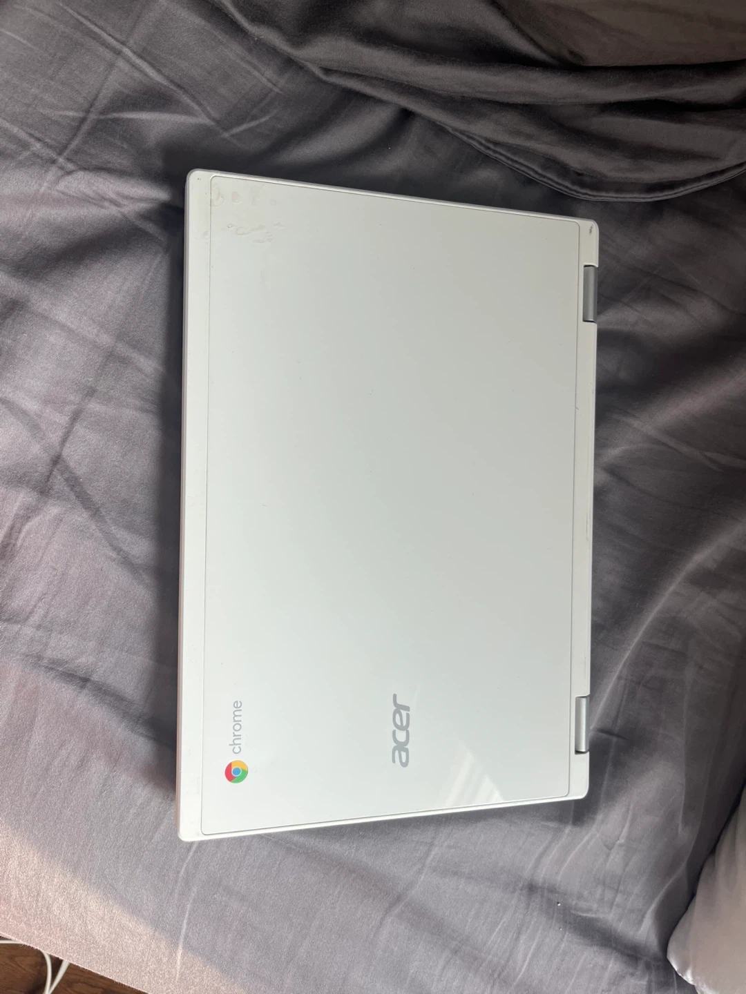 White Acer Chromebook laptop with charger included. It's a portable device for everyday tasks. Good for school or work! Also comes with a working charger!