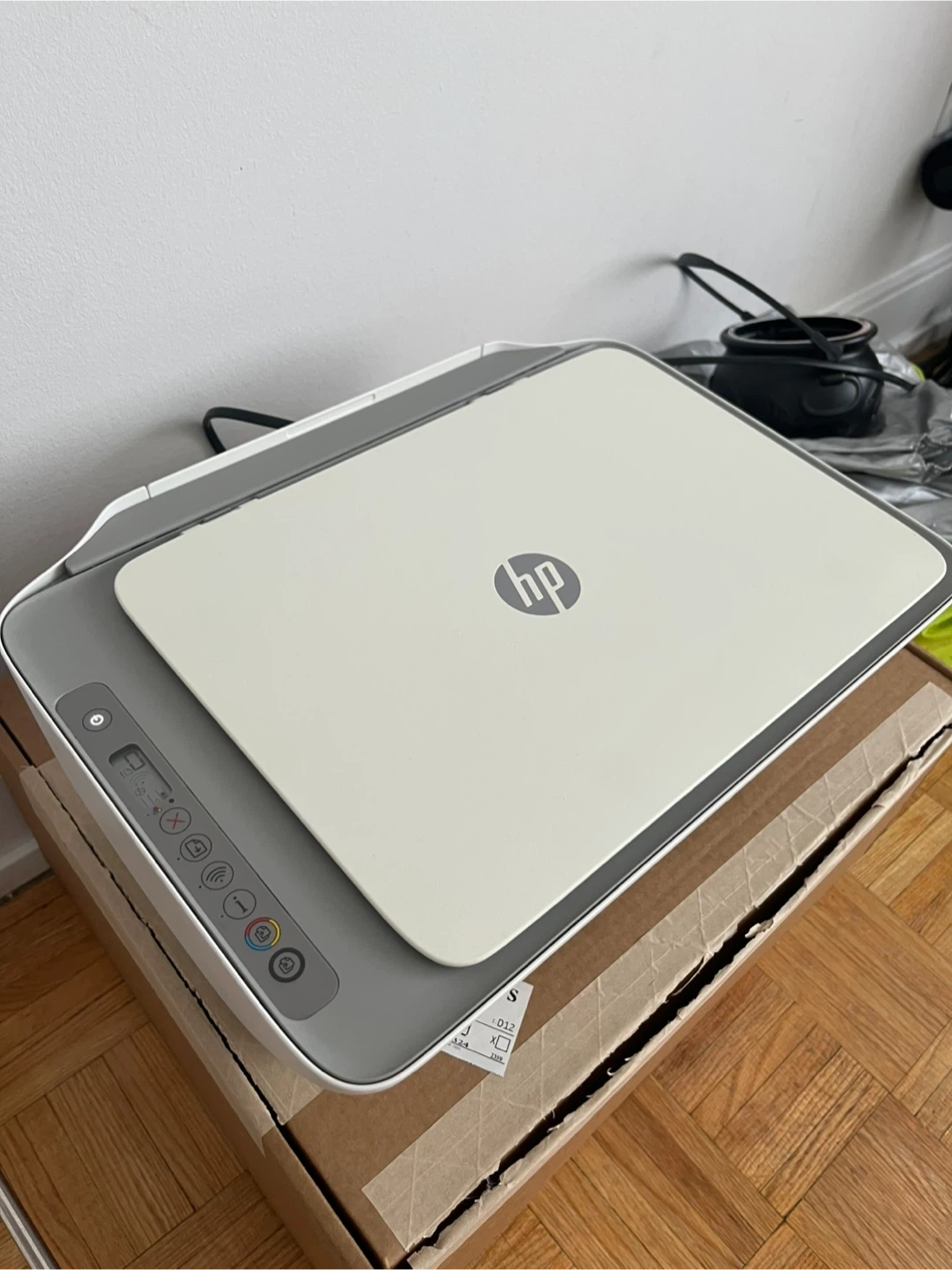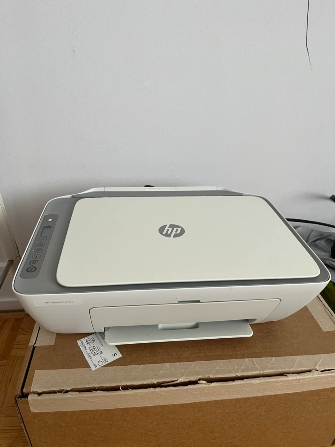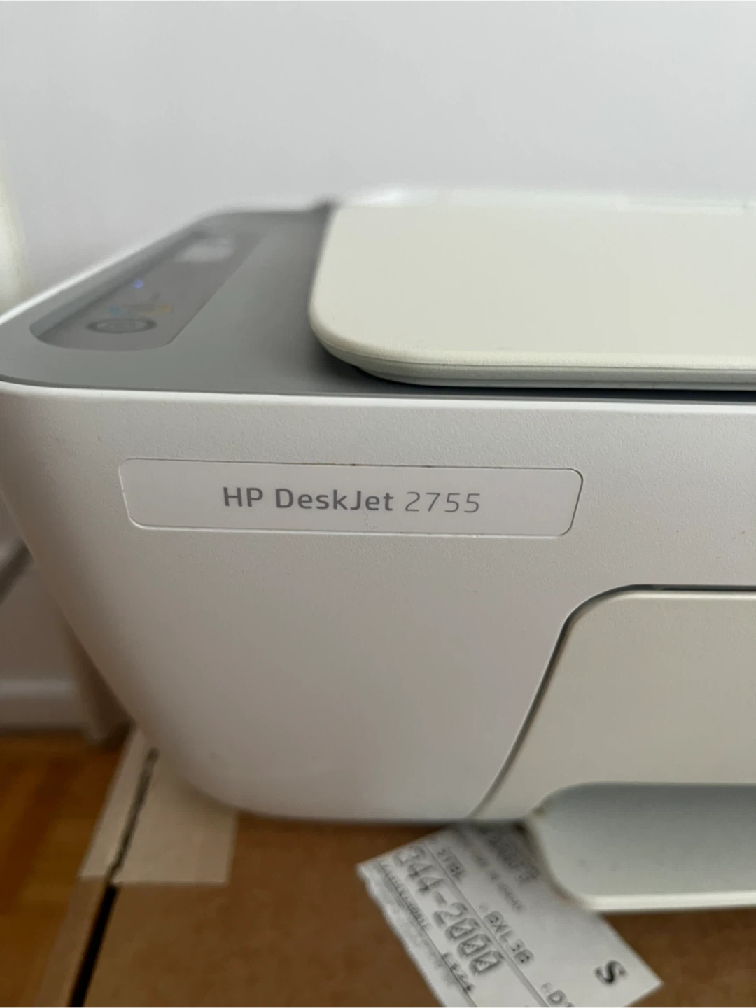 This HP DeskJet 2755 is an all-in-one printer, scanner, and copier. It's white and grey with a compact design. Connects via Wi-Fi. Perfect for home offices! Very good condition!