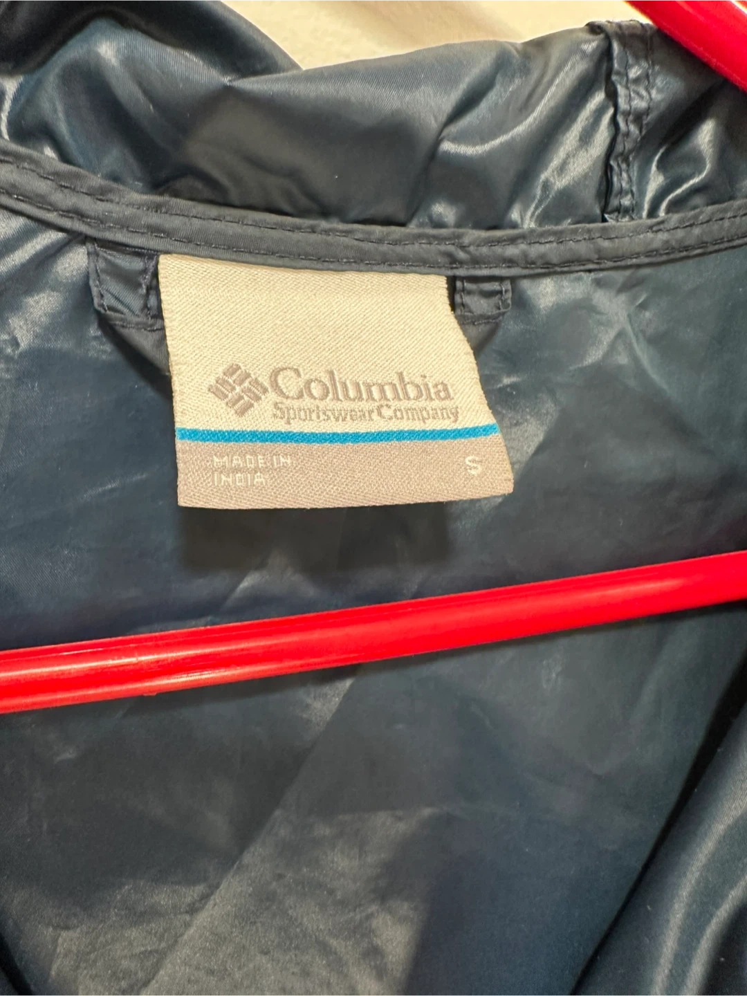 This is a Columbia Sportswear Company windbreaker jacket. It's a size small and features a navy blue and red colour blocking design. It's lightweight and suitable for outdoor activities.