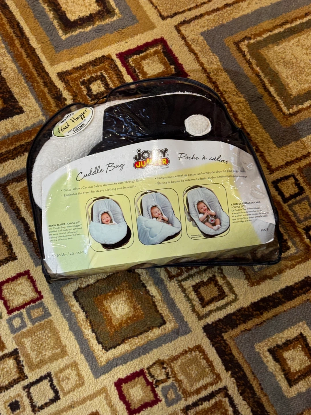 This Jolly Jumper Cuddle Bag makes it easy to pass car seat safety harnesses through. It eliminates the need for heavy clothing and snowsuits. The Cuddle Bag and Head Hugger combo has been crash tested and achieved the same safety level as without it. Suitable for babies 5-30 lbs.