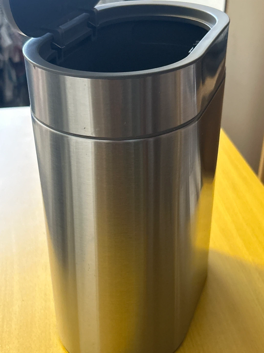 This stainless steel trash can has a sleek, modern design. Its lid is easy to open and close, making it convenient for any room. Perfect for keeping your space tidy!