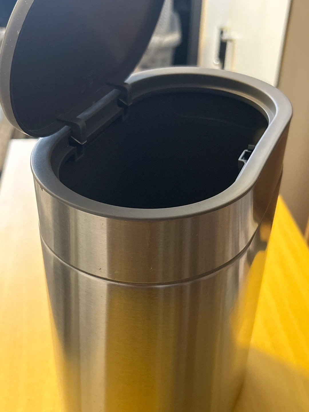 This stainless steel trash can has a sleek, modern design. Its lid is easy to open and close, making it convenient for any room. Perfect for keeping your space tidy!